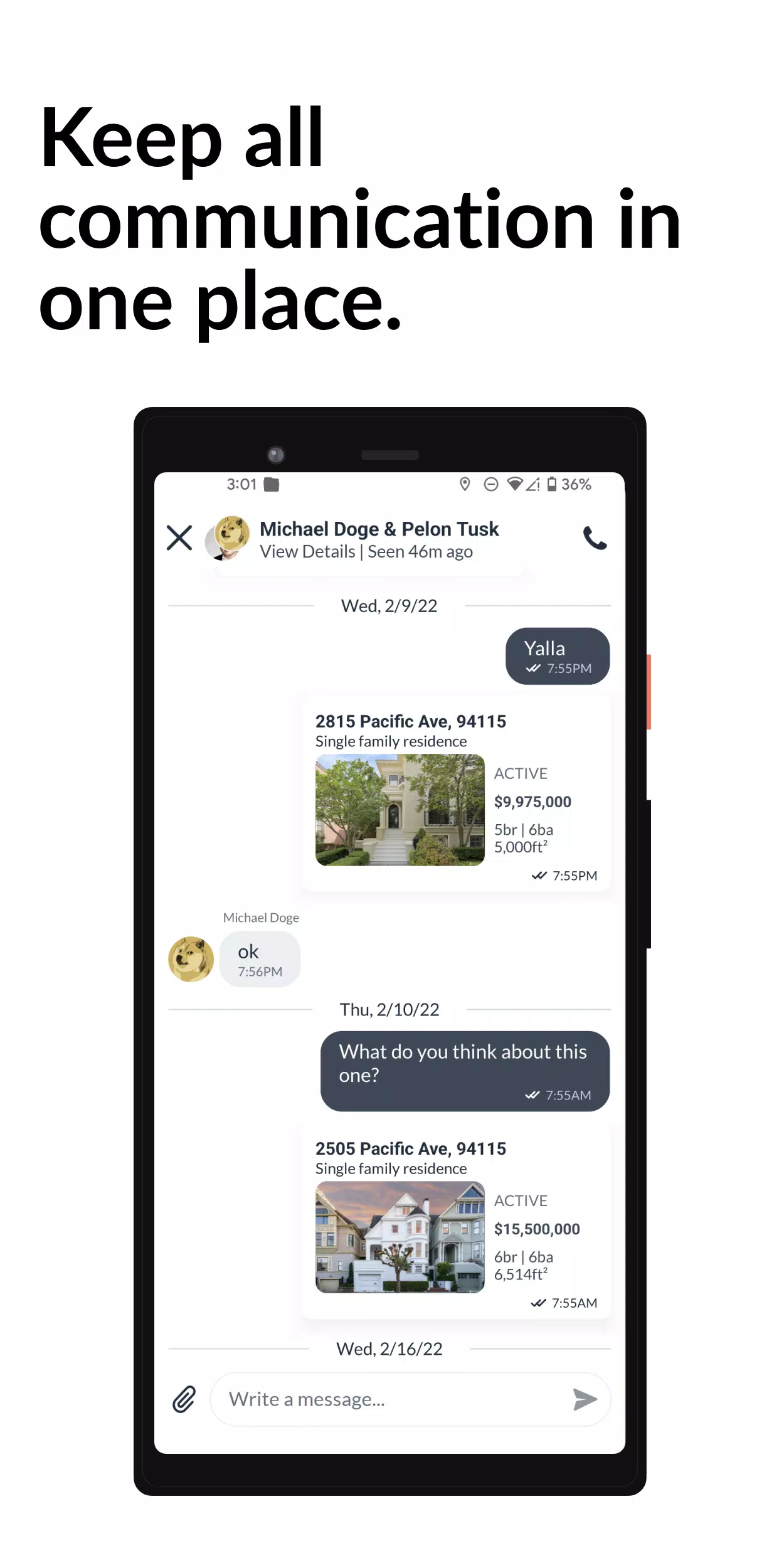 > In-App Collaboration: Seamlessly collaborate during the home buying process with integrated feed and chat features, making it easy to save listings, request tours, and communicate with co-buyers.
