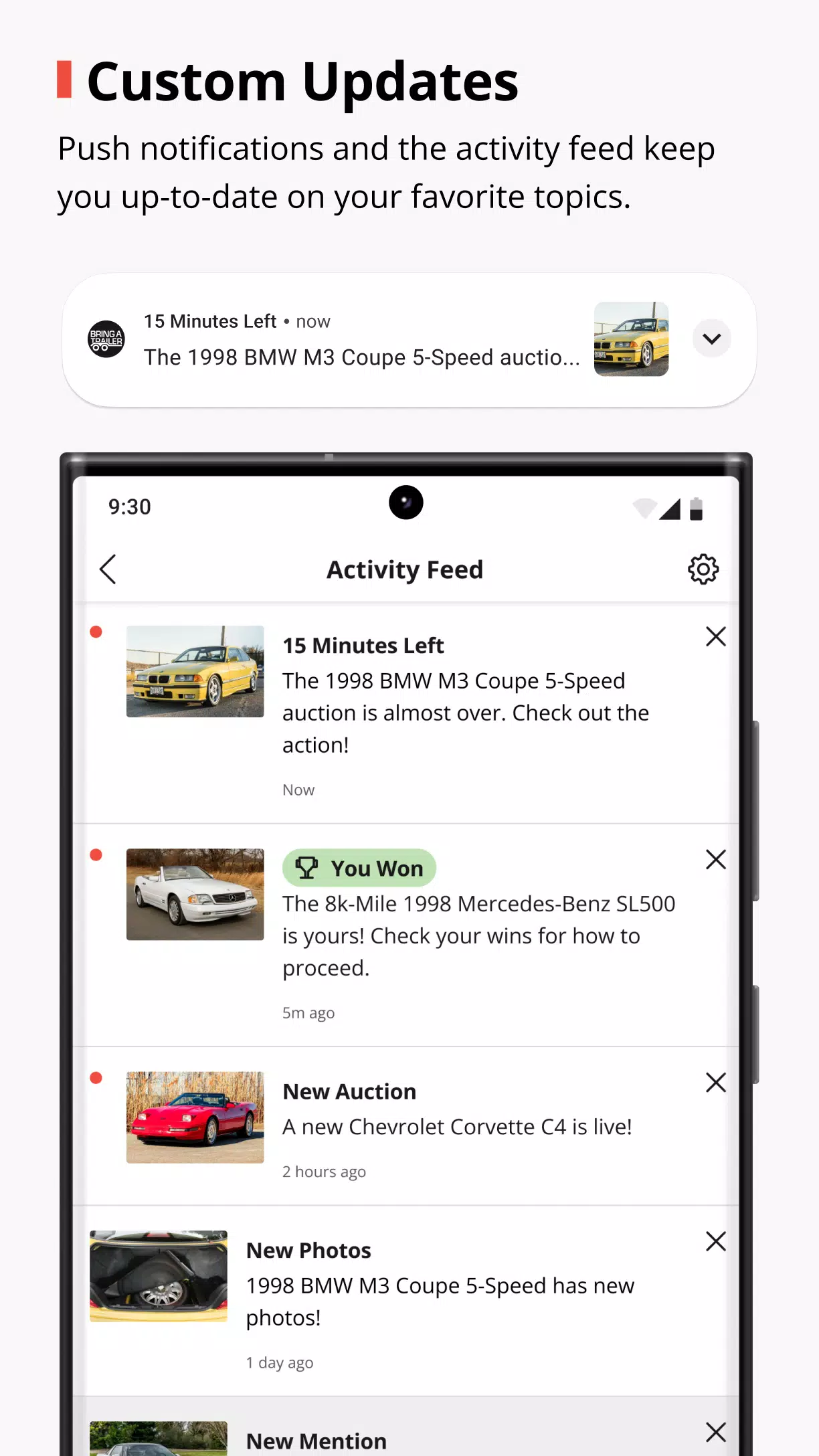 > Custom alerts and notifications: Stay up to date with push notifications and the Activity Feed on your favorite topics and auctions in real time.