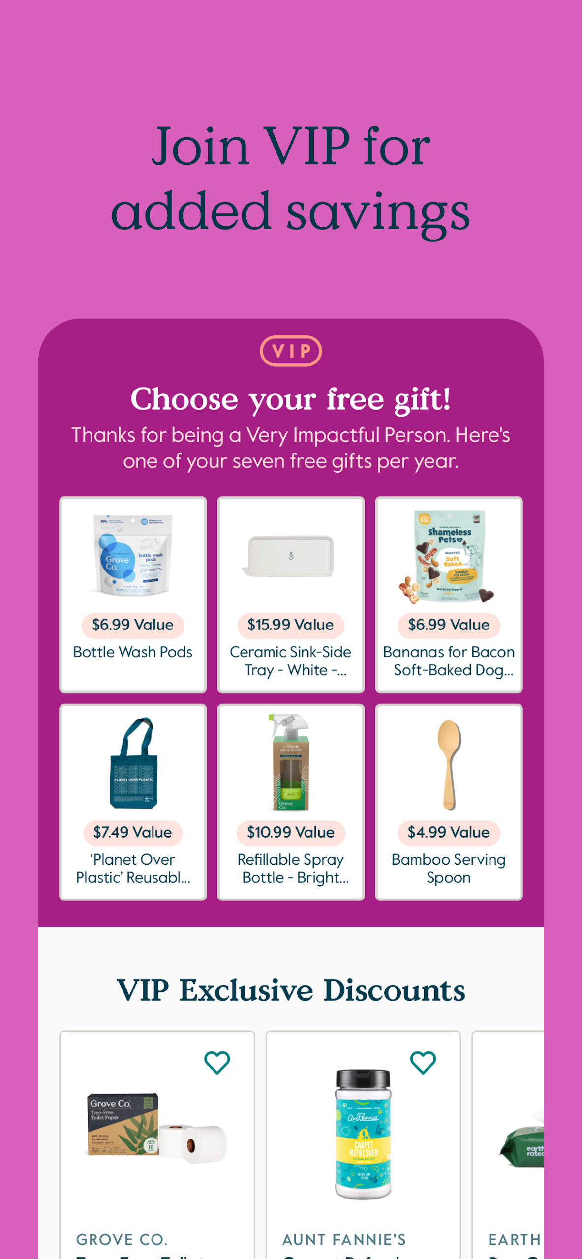 Become a VIP member and enjoy fantastic perks such as annual savings, fast carbon-neutral shipping on orders over $> exclusive gifts, and special discounts in the VIP Hub. With Grove, you'll feel like a valued customer.
