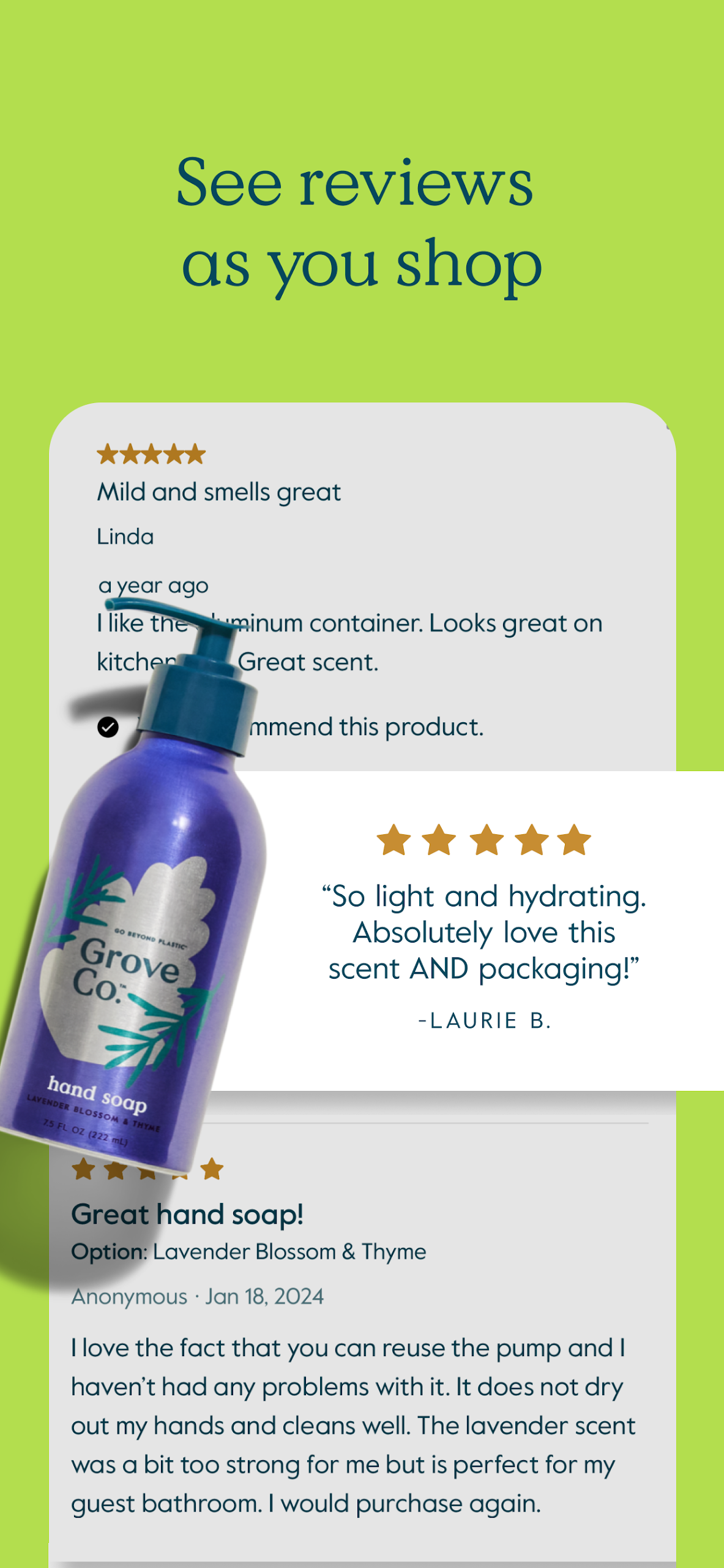 With the Grove Collaborative app, taking care of your household's needs has never been easier. From non-toxic products to customizable refill deliveries, Grove offers everything you need for a clean and healthy home. Shop with confidence knowing that you're supporting socially responsible brands that prioritize human and environmental well-being. Download the Grove app today and discover a new way to shop for home essentials.
