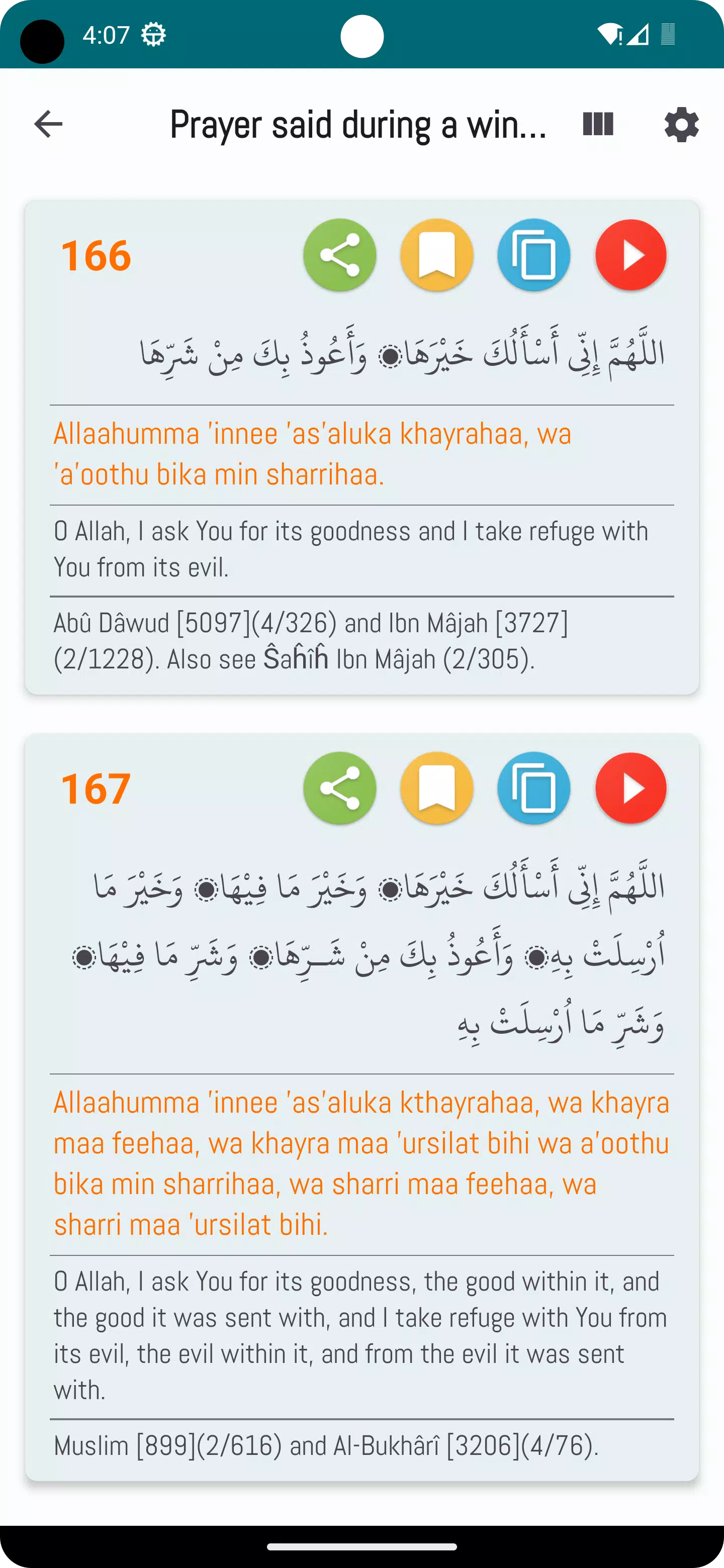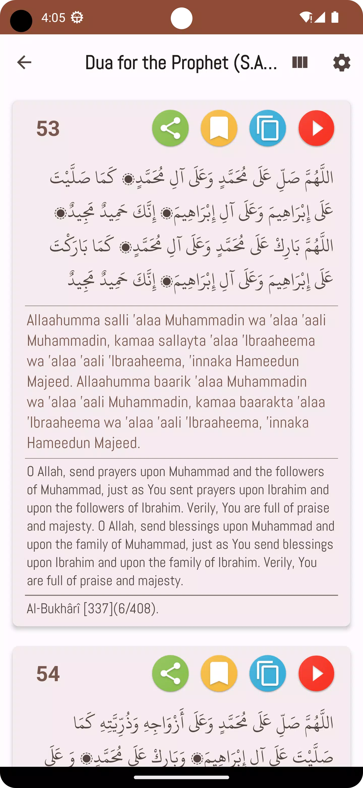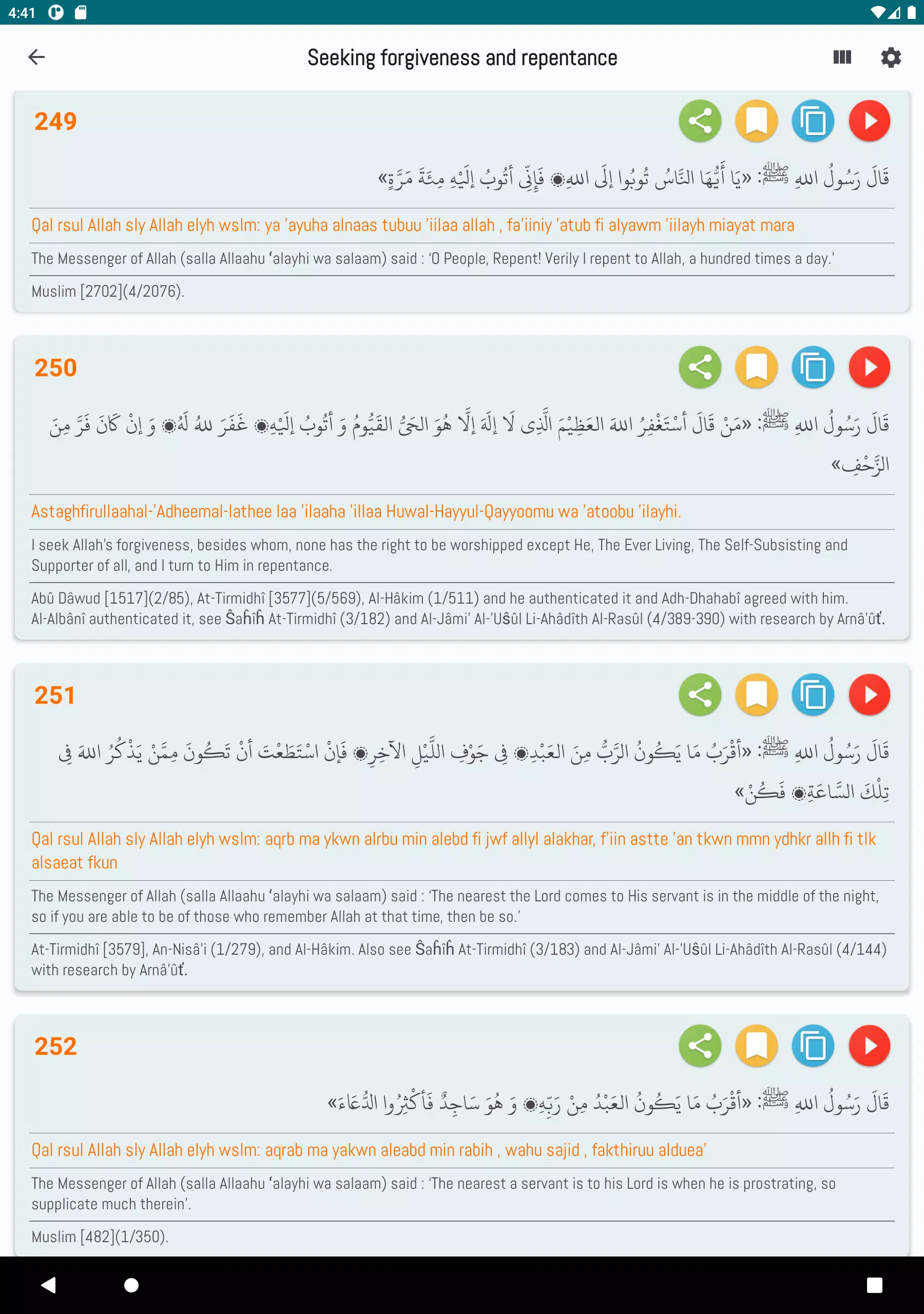 * Multilingual Support: The app includes Duas in their original Arabic text, along with English transliteration and translation, catering to a diverse range of users with varying language preferences.