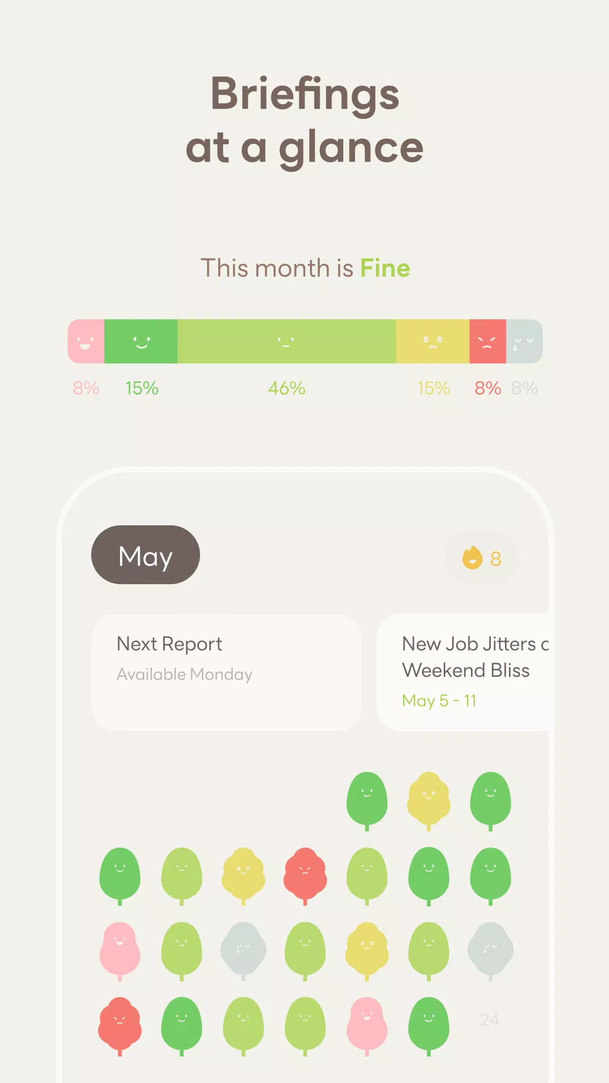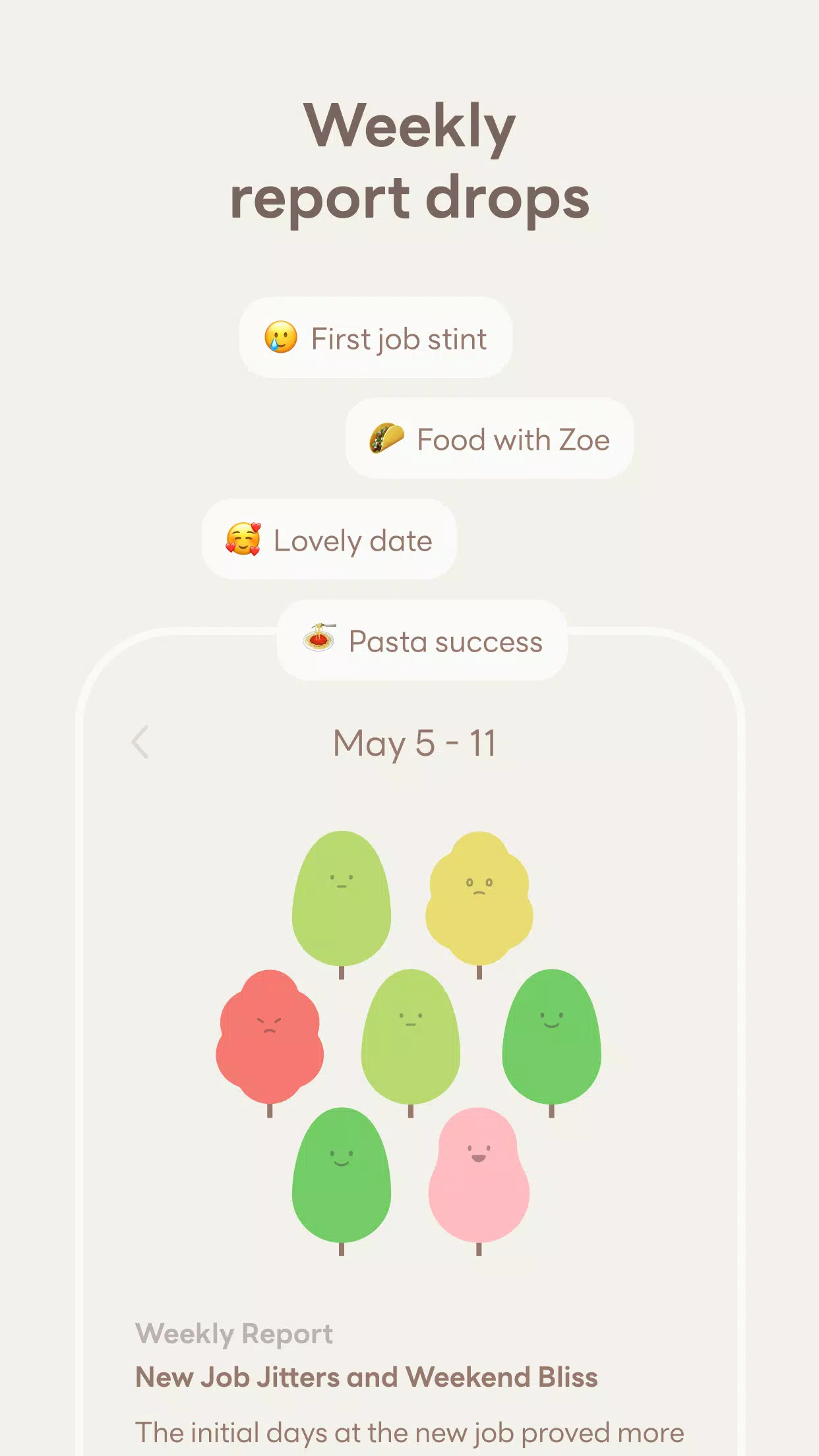 * Weekly Reports: Receive a weekly report based on your daily entries, including a newly written journal and highlights from all the trees you've planted.