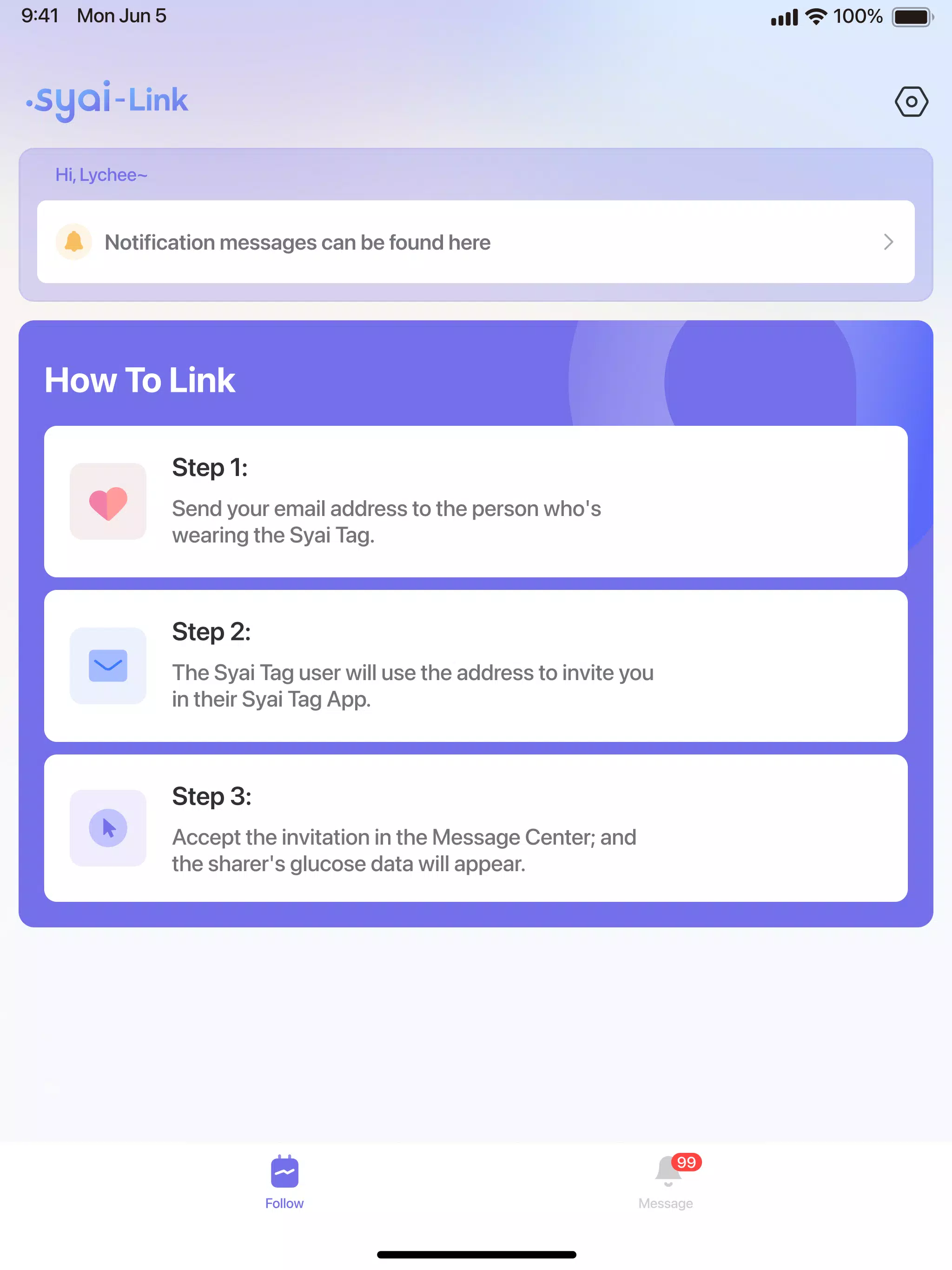 Stay connected with your loved ones' glucose levels easily with Syai Link. This user-friendly app allows caregivers and family members to access real-time glucose data and trend graphs, ensuring your loved one is always in good hands. Receive notifications and updates instantly, making it simple to stay informed and provide the best care possible. Please note, Syai Link is specifically designed for glucose data sharing with Syai Health devices and registered users, and is not a substitute for professional medical advice. Remember to always consult healthcare professionals for any medical decisions. For users outside the European Union, ensure compliance with local laws before using this app.