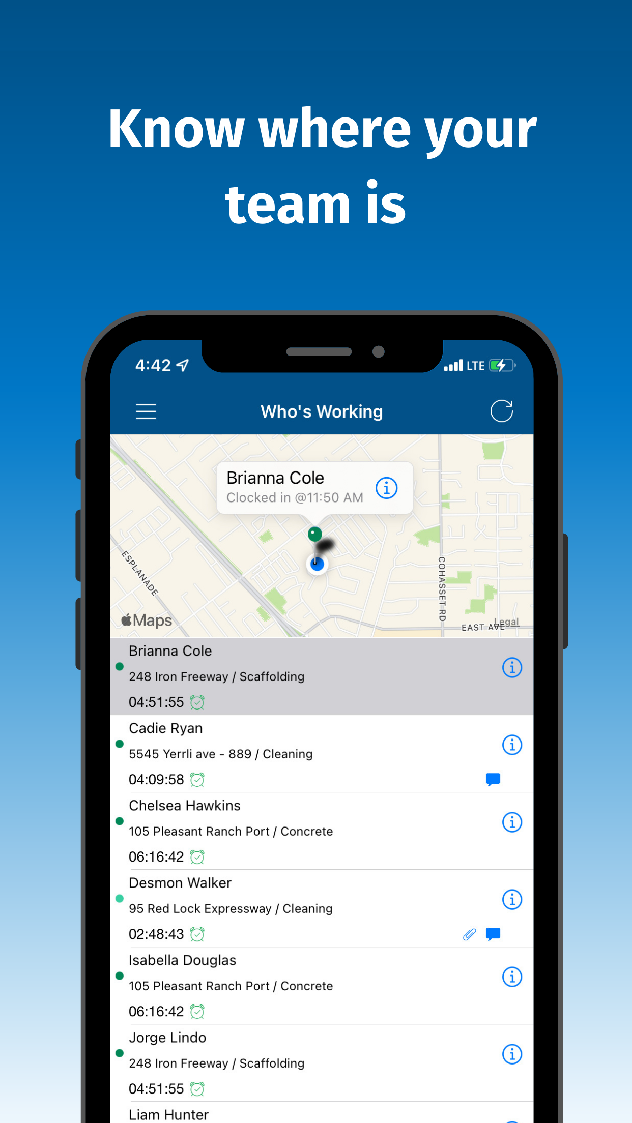 Monitor Team Presence: Keep track of your entire workforce's onsite presence with Who's Working Now, and track their movements with the GPSTrak feature.