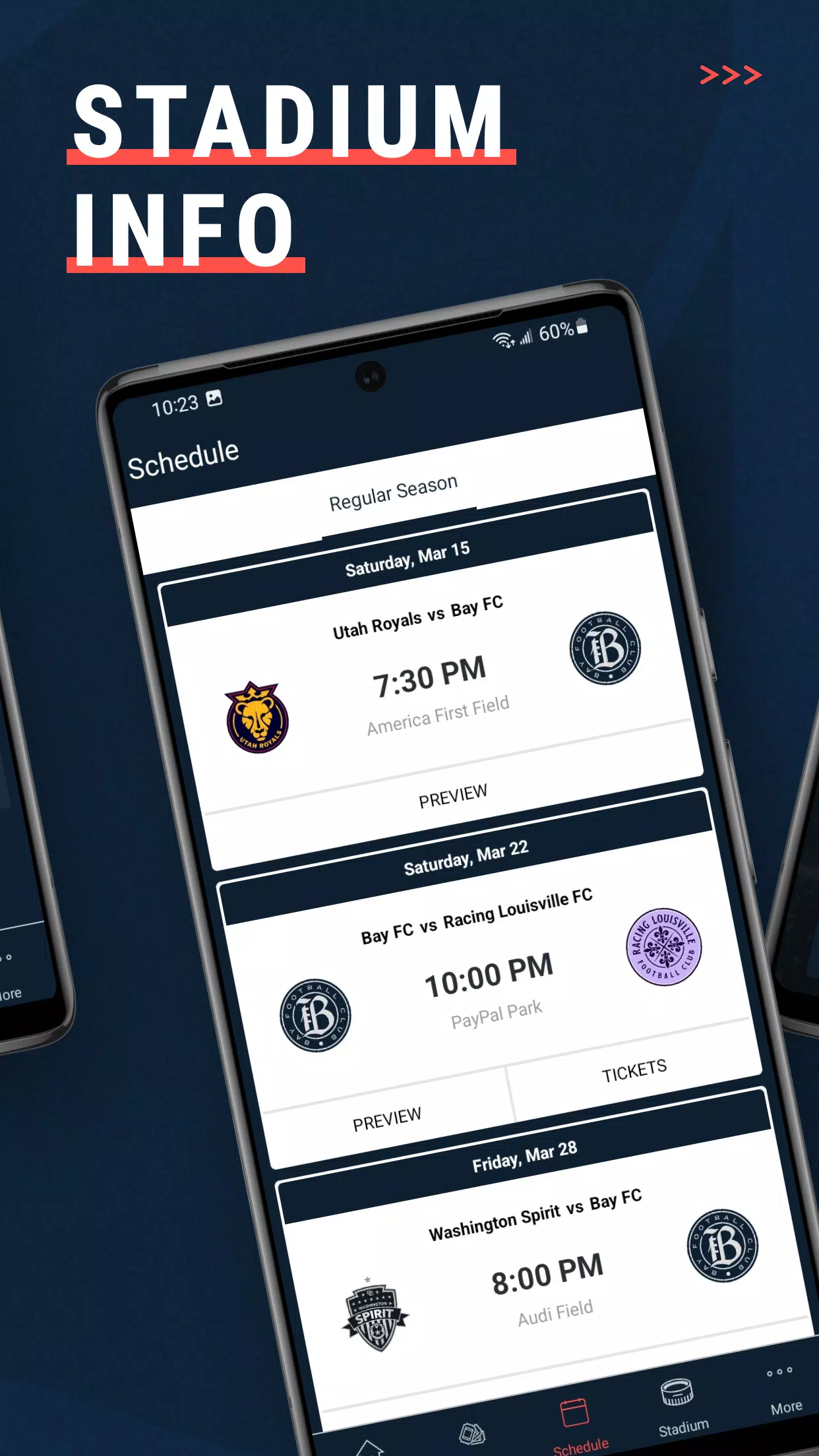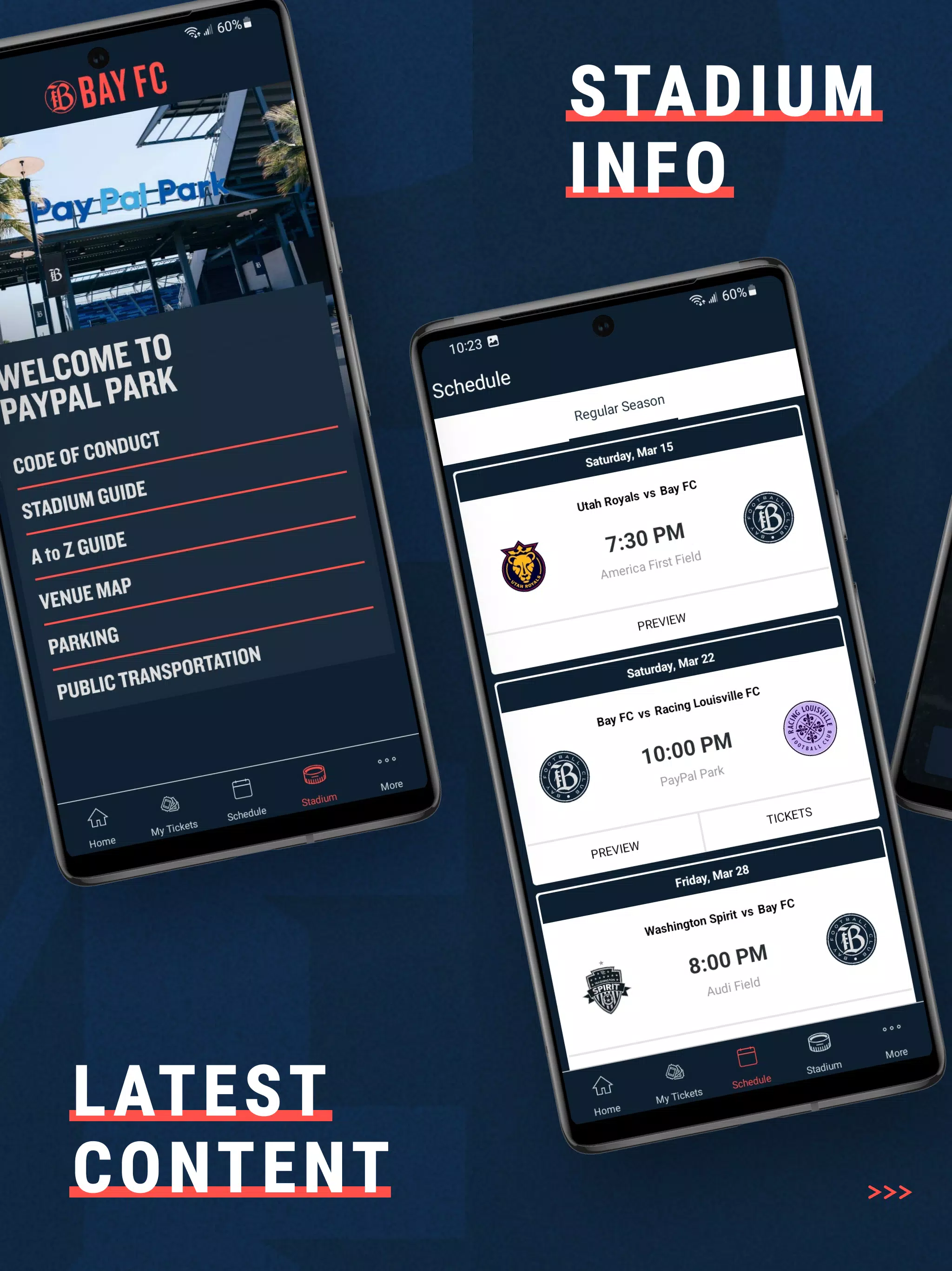 Immerse yourself in the thrilling world of NWSL soccer with the official Bay FC App! With this ultimate matchday companion, you can stay on top of the dynamic schedule, get exclusive news feeds, explore the stadium guide, easily purchase tickets, learn about the team roster, shop for merchandise, and receive push notifications for match reminders and exclusive offers. Elevate your soccer experience by joining the vibrant Bay FC community and never miss a goal again. Download the Bay FC App now and get direct access to the heart of Bay Area soccer fandom. It's more than just an app; it's your soccer hub!