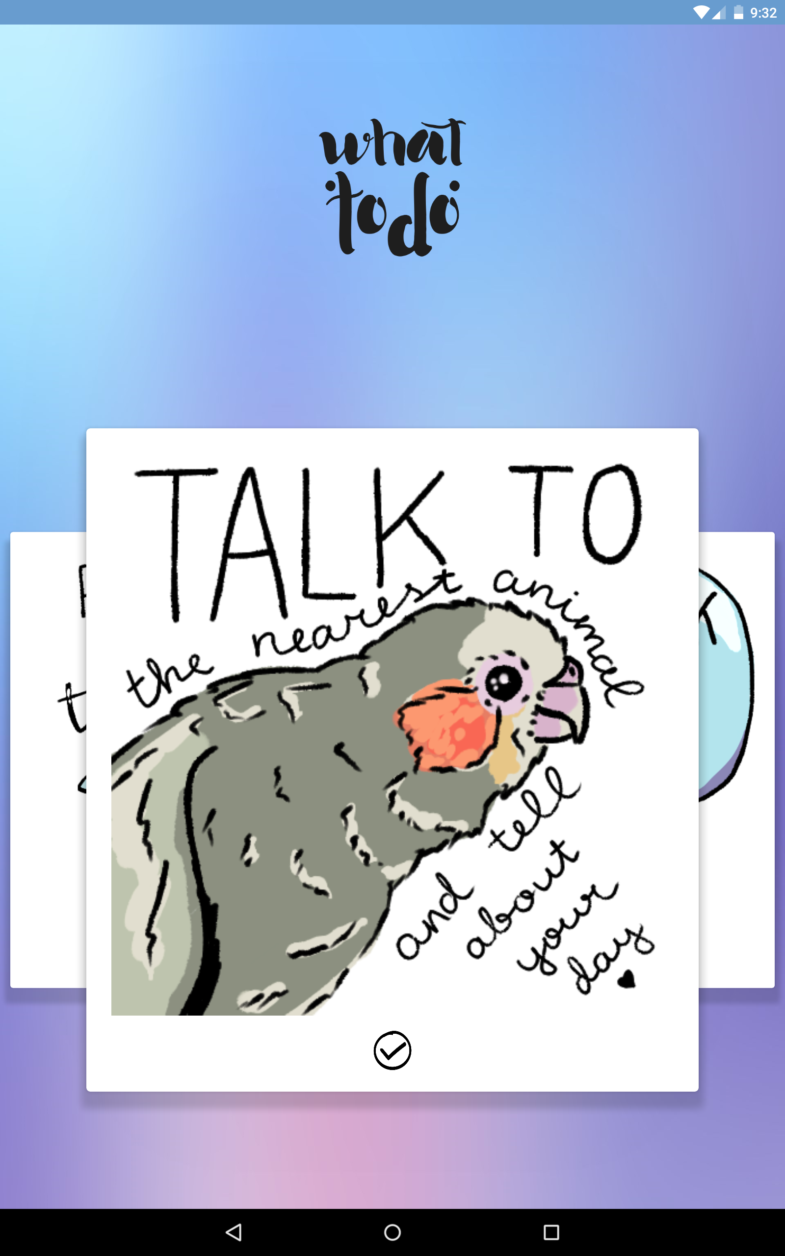 "What to Do - daily good ideas" is a charming and purpose-driven app that will uplift your spirits and inject intention into your daily life. With a variety of activities to choose from, both solo and social, you'll never run out of ways to create memorable moments and cultivate joy. Download the app today and start exploring new experiences that will bring meaning and fulfillment to your days.