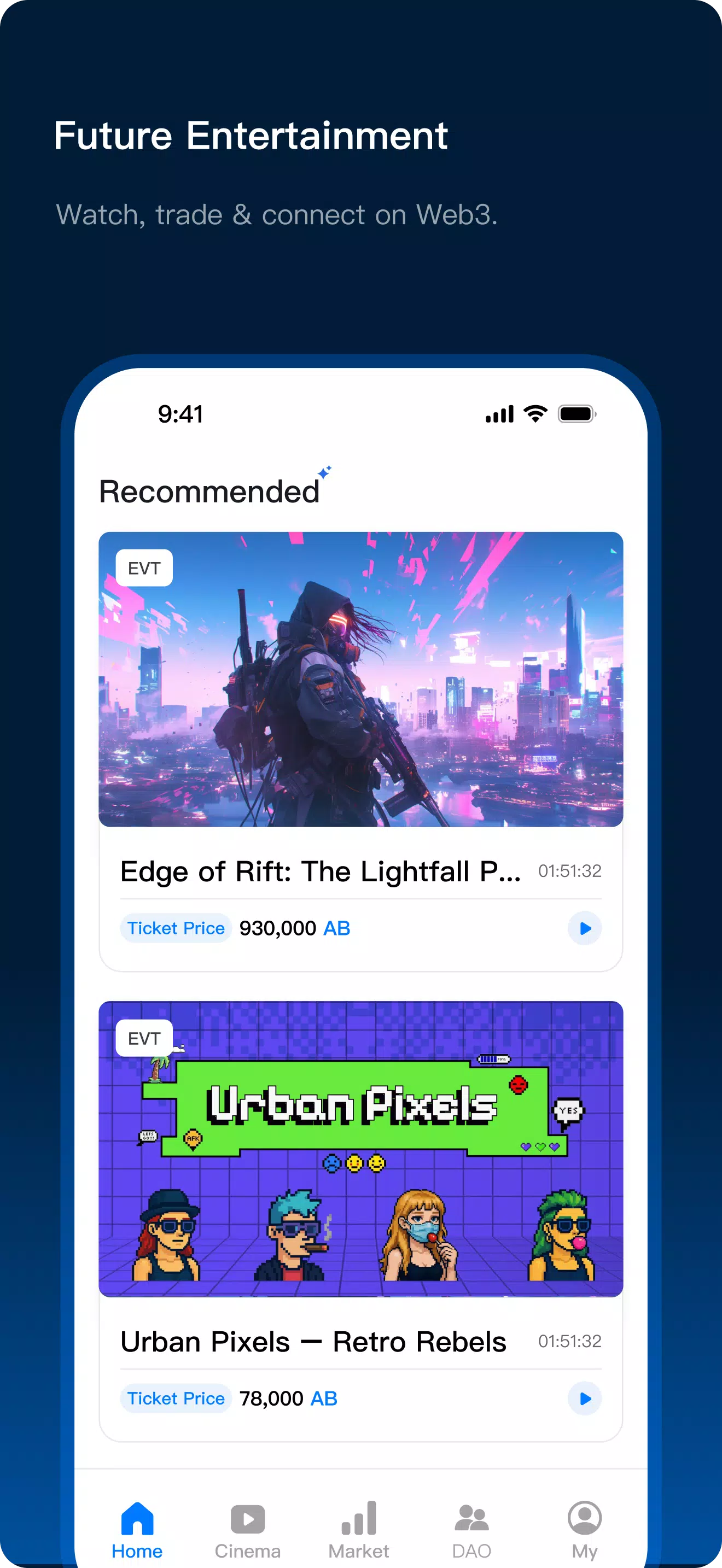 Transforming the way we experience entertainment, ABE is a cutting-edge platform that seamlessly combines blockchain technology with a vast array of digital assets such as films, television series, and collectibles. Offering users a convenient one-stop solution for trading, distribution, and entertainment, ABE allows for multi-asset trading through EVT and NFT technologies. With a focus on community inclusivity, ABE welcomes participants from around the world, creating a culturally diverse space where digital cultures converge. Additionally, ABE introduces a unique "Ticketing-To-Earn" feature, enabling users to earn rewards by distributing tickets to those who own assets of films and television series. Join ABE today for a truly revolutionary entertainment experience.