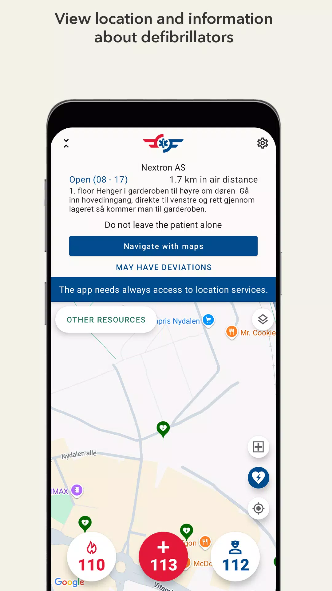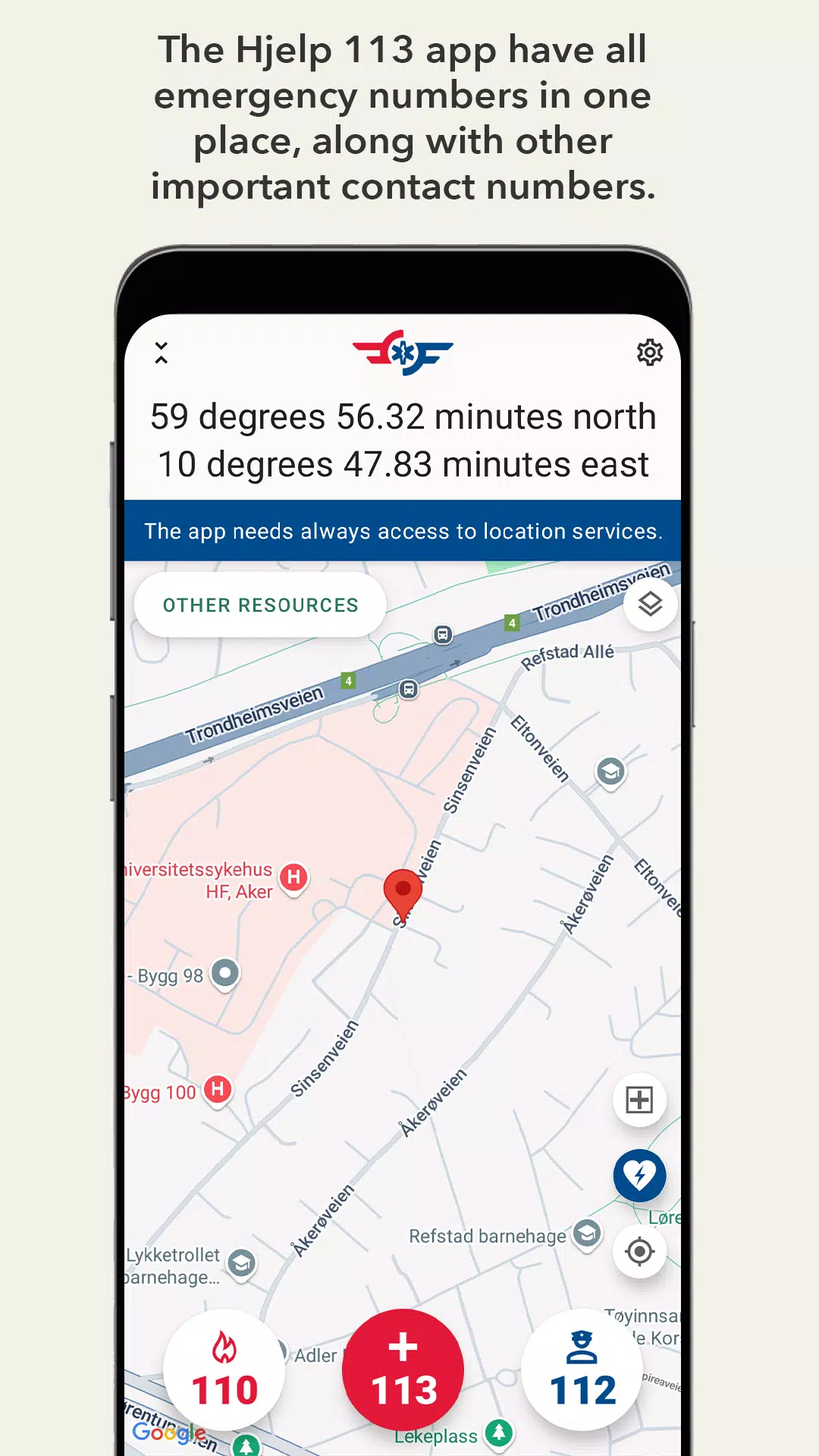In conclusion, this app provides a convenient way to access all emergency numbers in Norway, as well as other important contacts, making it easier to reach the right services in times of need. With features like showing your exact location and locating the nearest defibrillator, Hjelp 113 is a must-have tool for handling emergencies effectively. Download now for peace of mind and quick access to help when it's needed most.