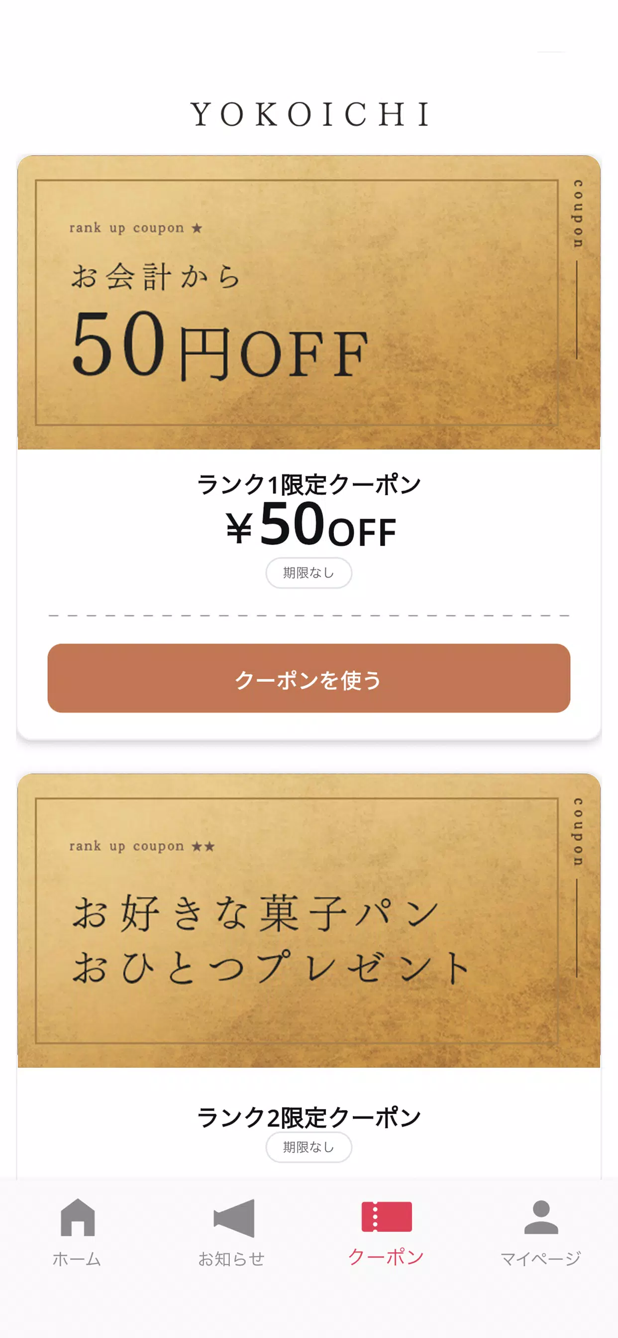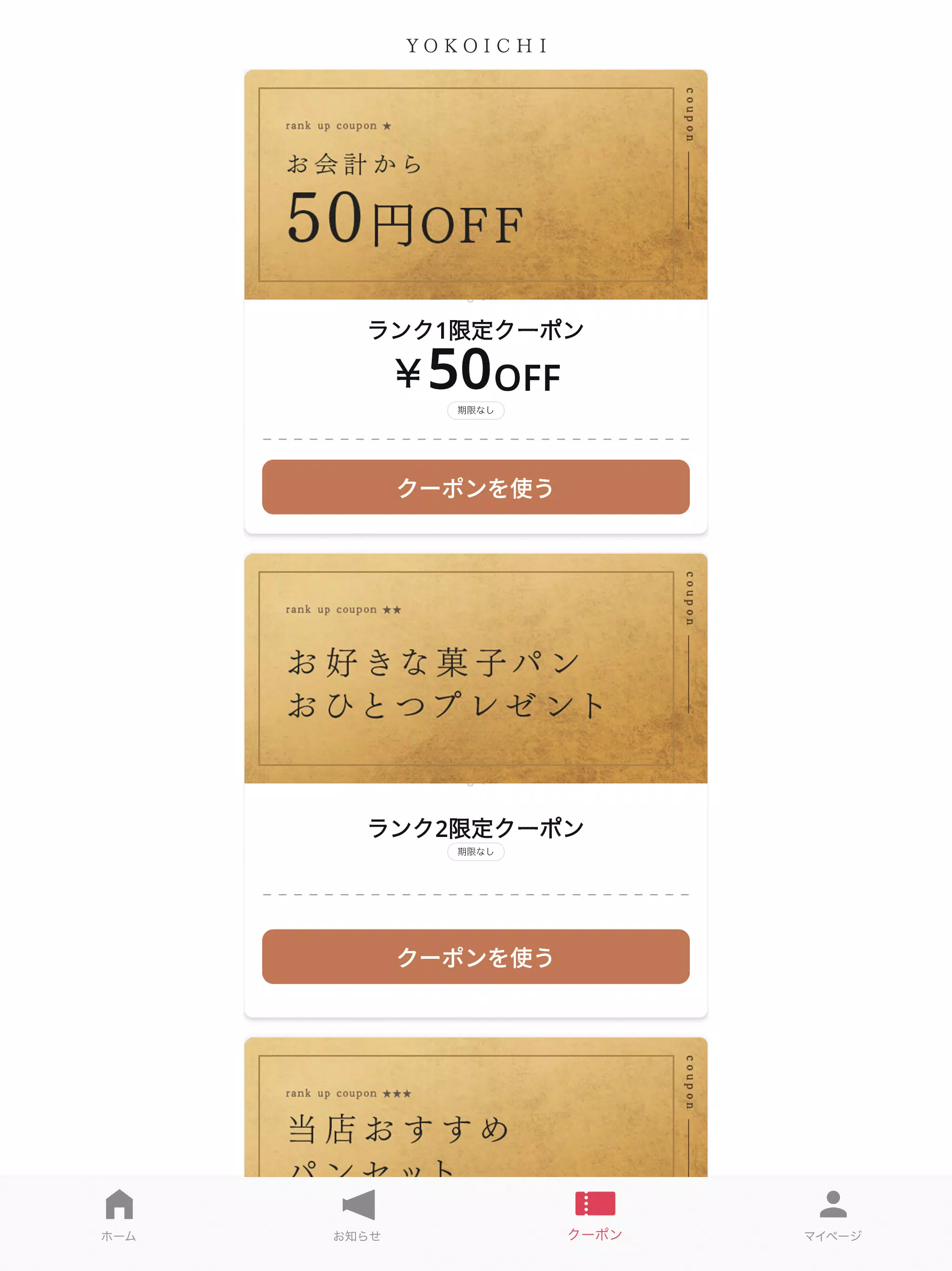 - Make it a habit to check the app regularly for new discount coupons and special offers. By staying informed about the latest deals, you can save money on your favorite bakery treats and make each visit to YOKOICHI even more enjoyable.