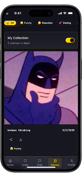 In conclusion, MemePickup Beta is the must-have app for anyone looking to add humor, confidence, and fun to their conversations. With its AI Pickup Line Generator, Meme Vault, and Chat Helper features, you'll never run out of content to keep your chats entertaining and engaging. Download now to level up your meme game and become the life of the party!