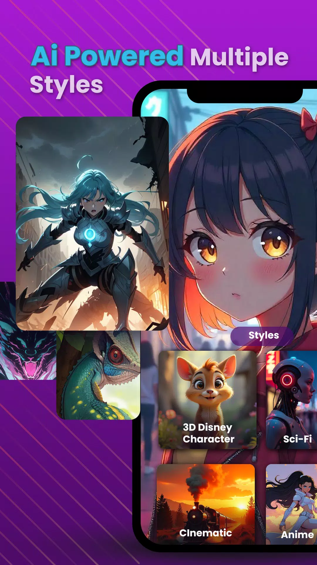 Multiple Artistic Styles: Choose from a variety of AI-powered styles to create unique and visually stunning images in 3D art.