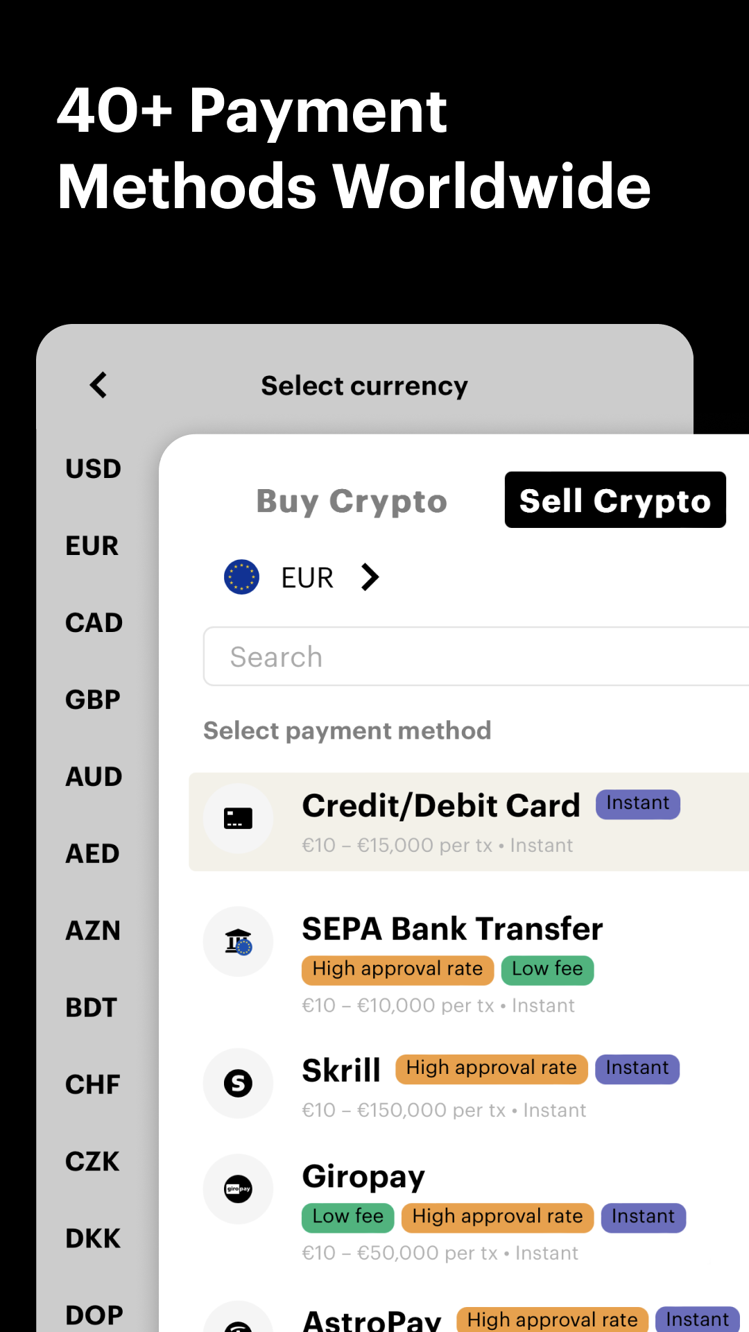 Access your Paybis crypto Bitcoin wallet from anywhere in the world and enjoy multiple payment methods for instant purchases using a credit card through a user-friendly mobile interface.