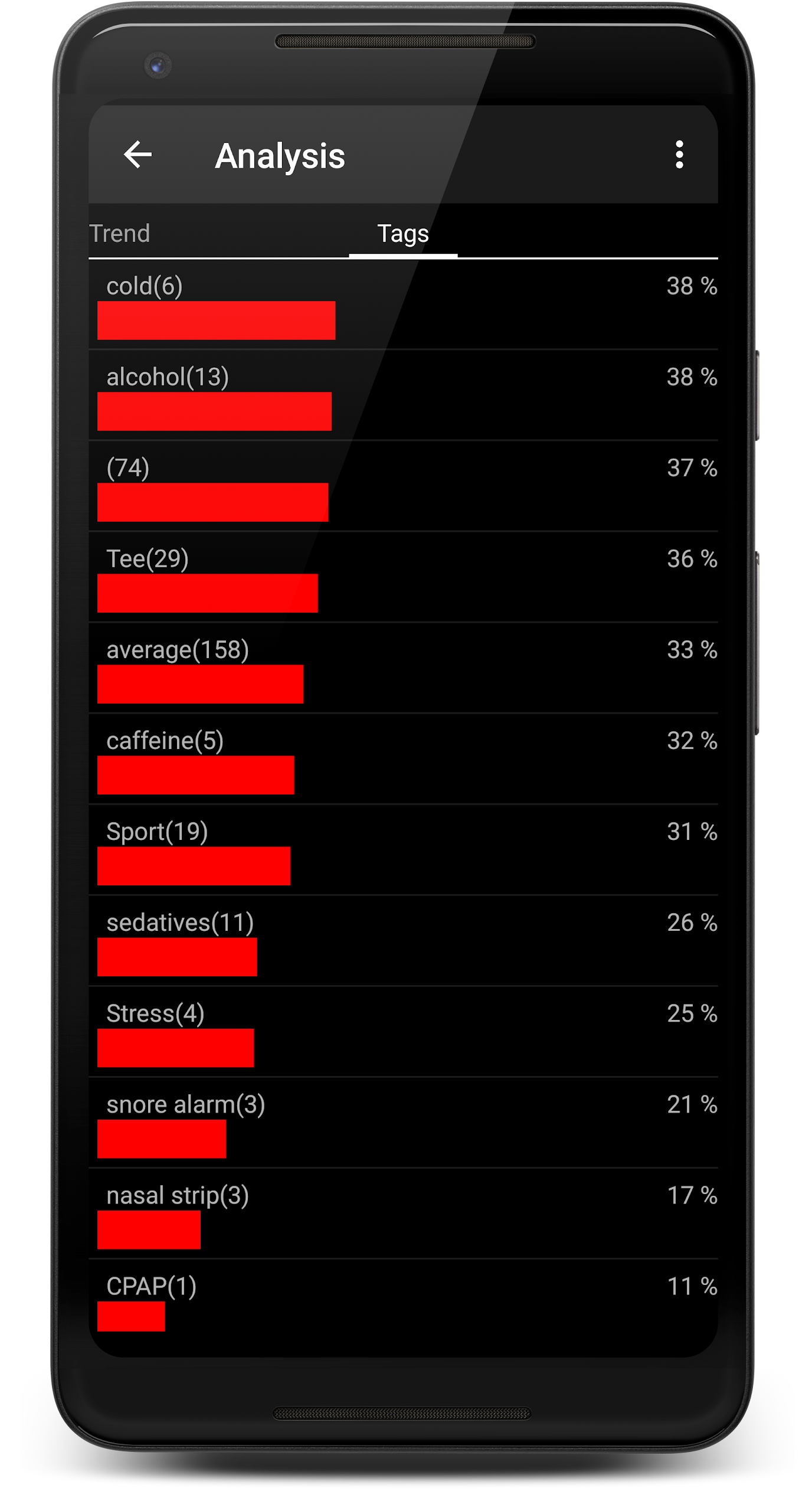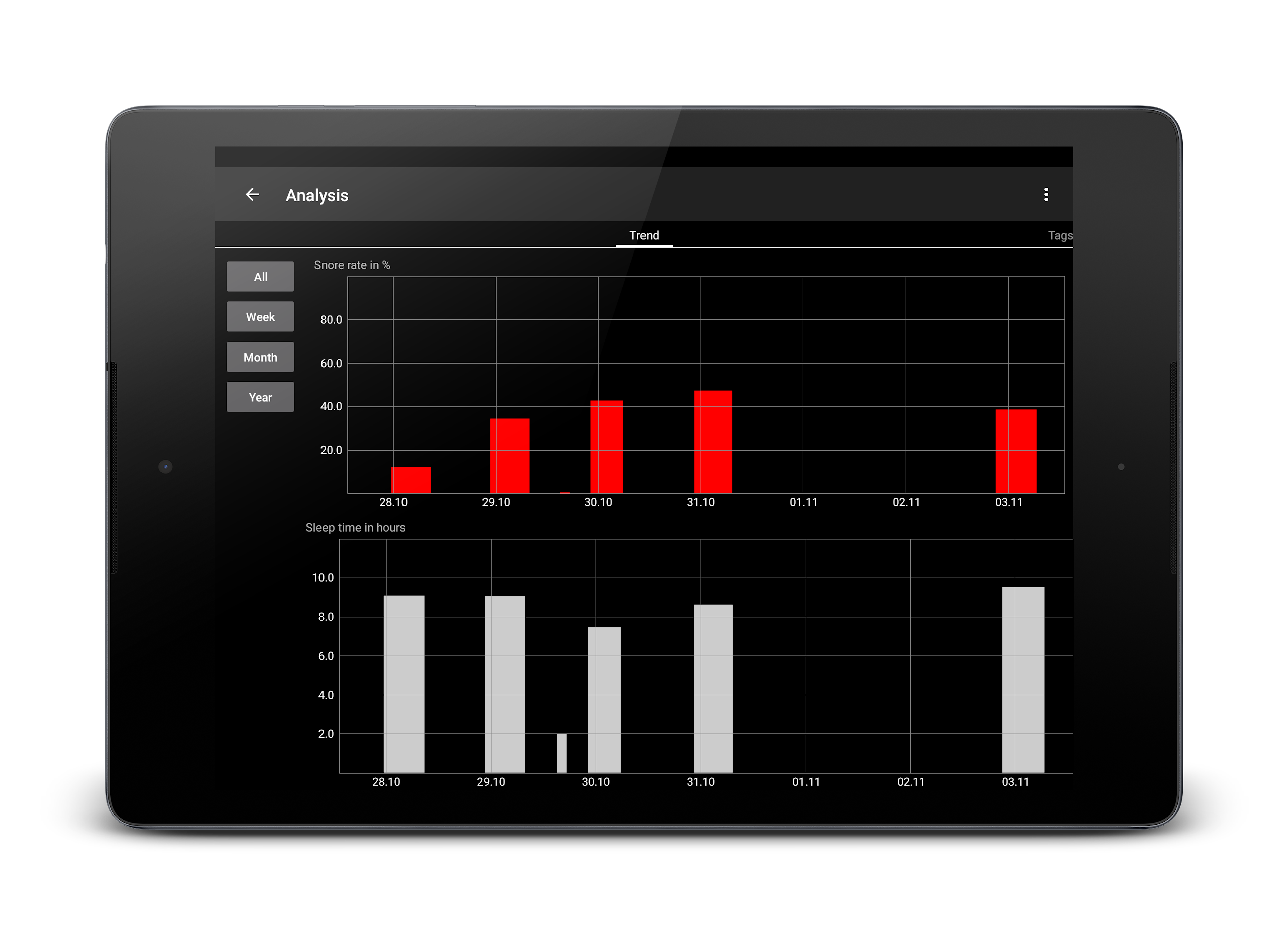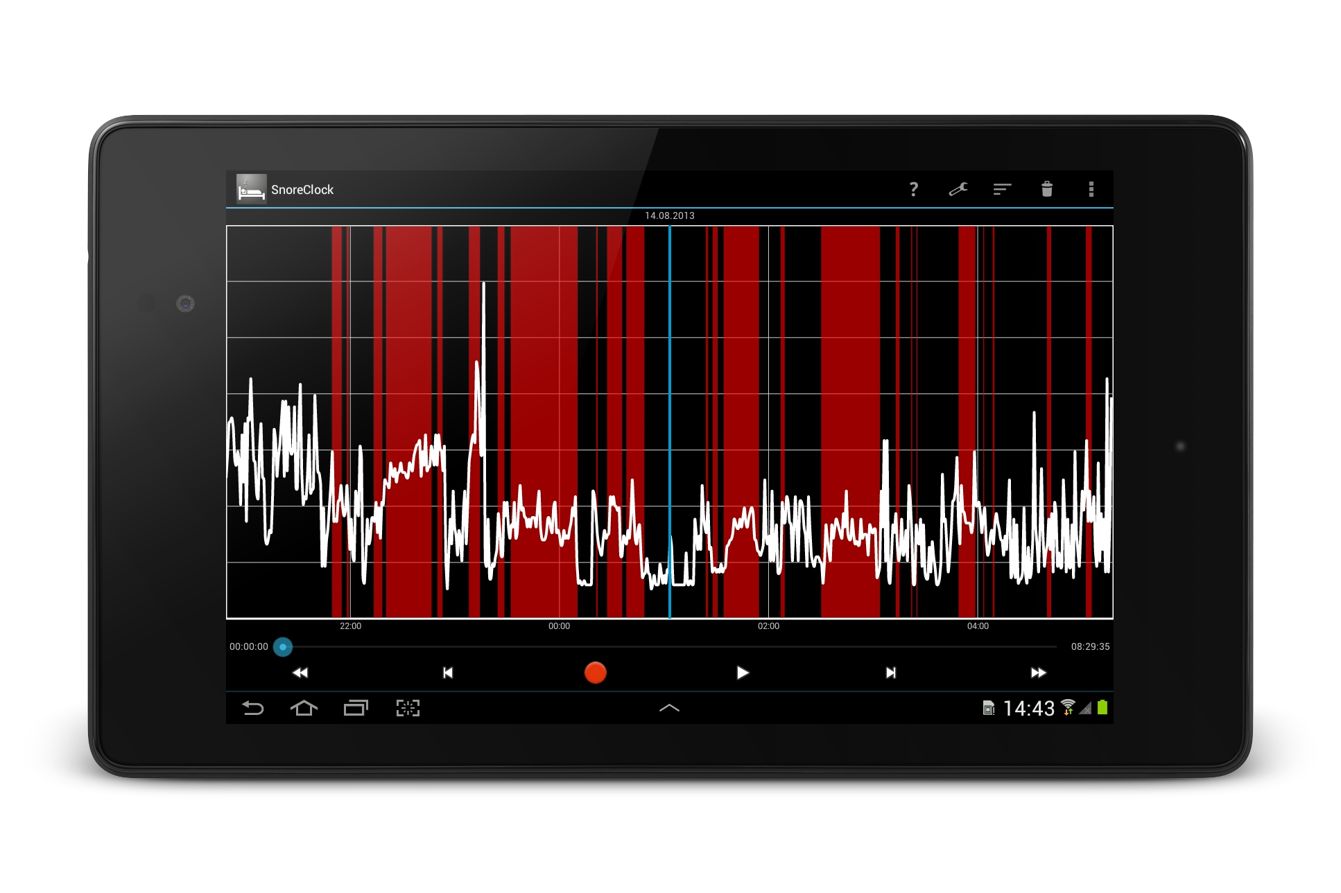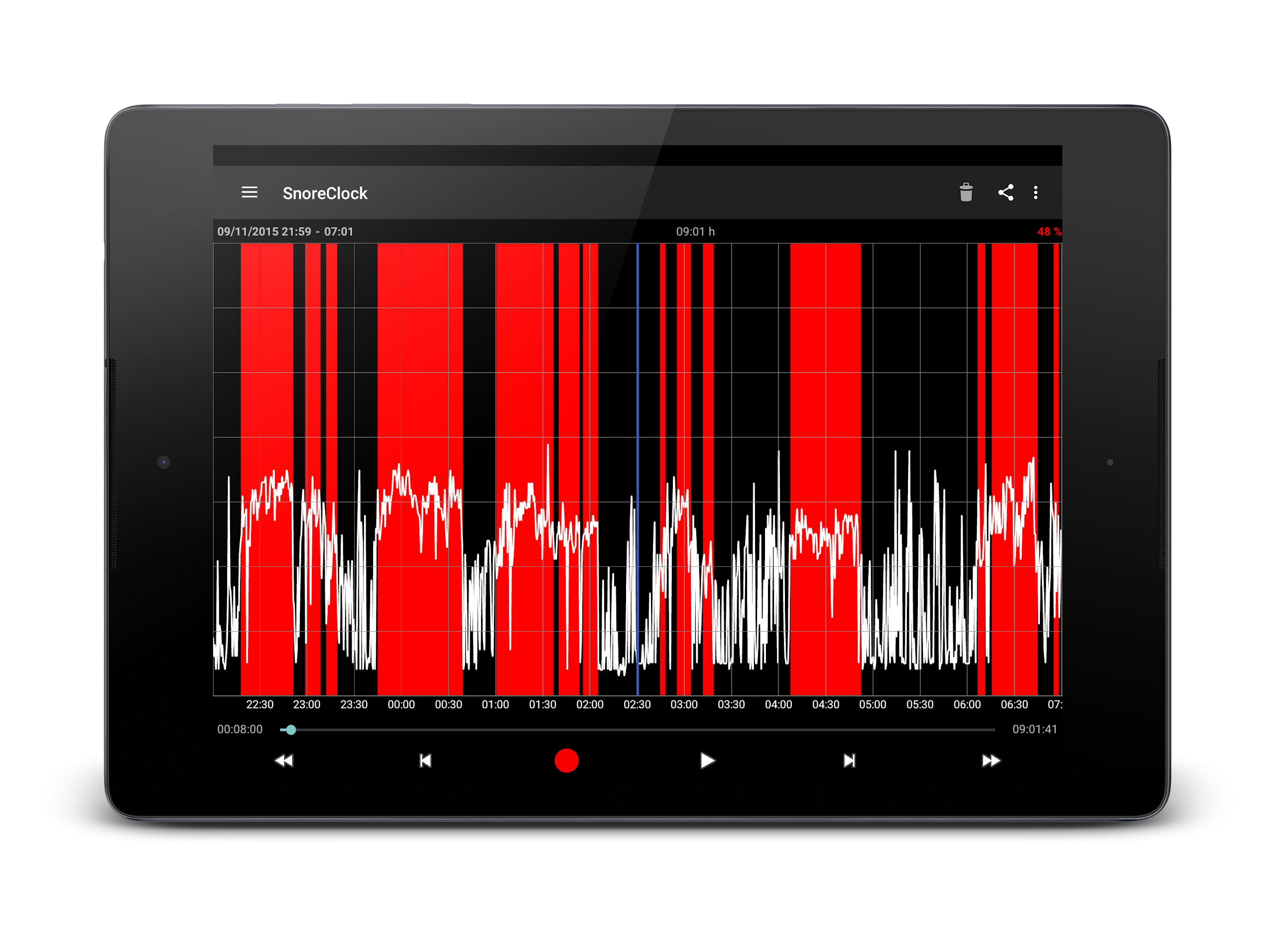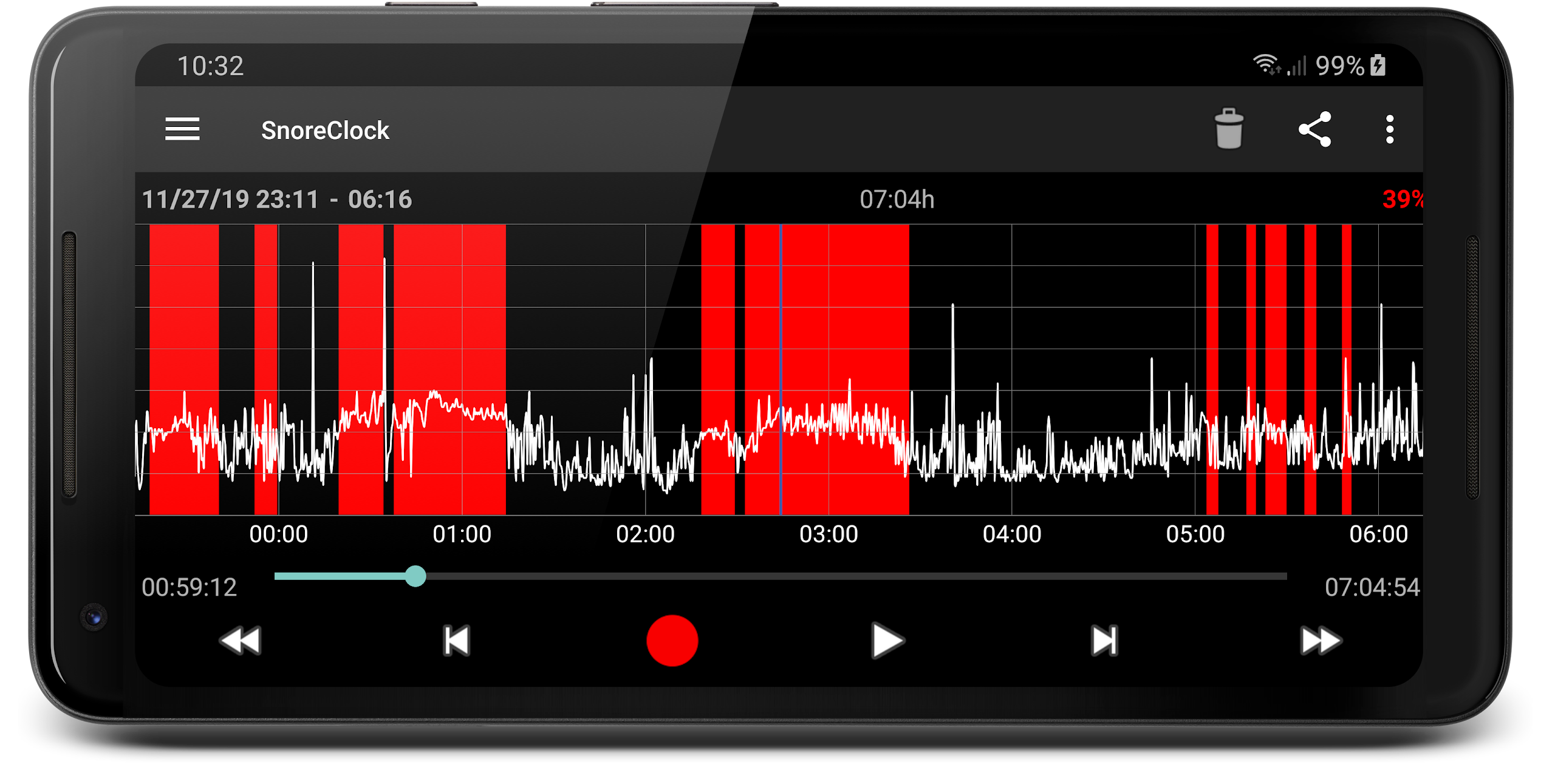 ⭐ Detailed Analysis: SnoreClock offers a comprehensive analysis of your nightly noises, including detailed insights on potential snoring instances represented by red bars.