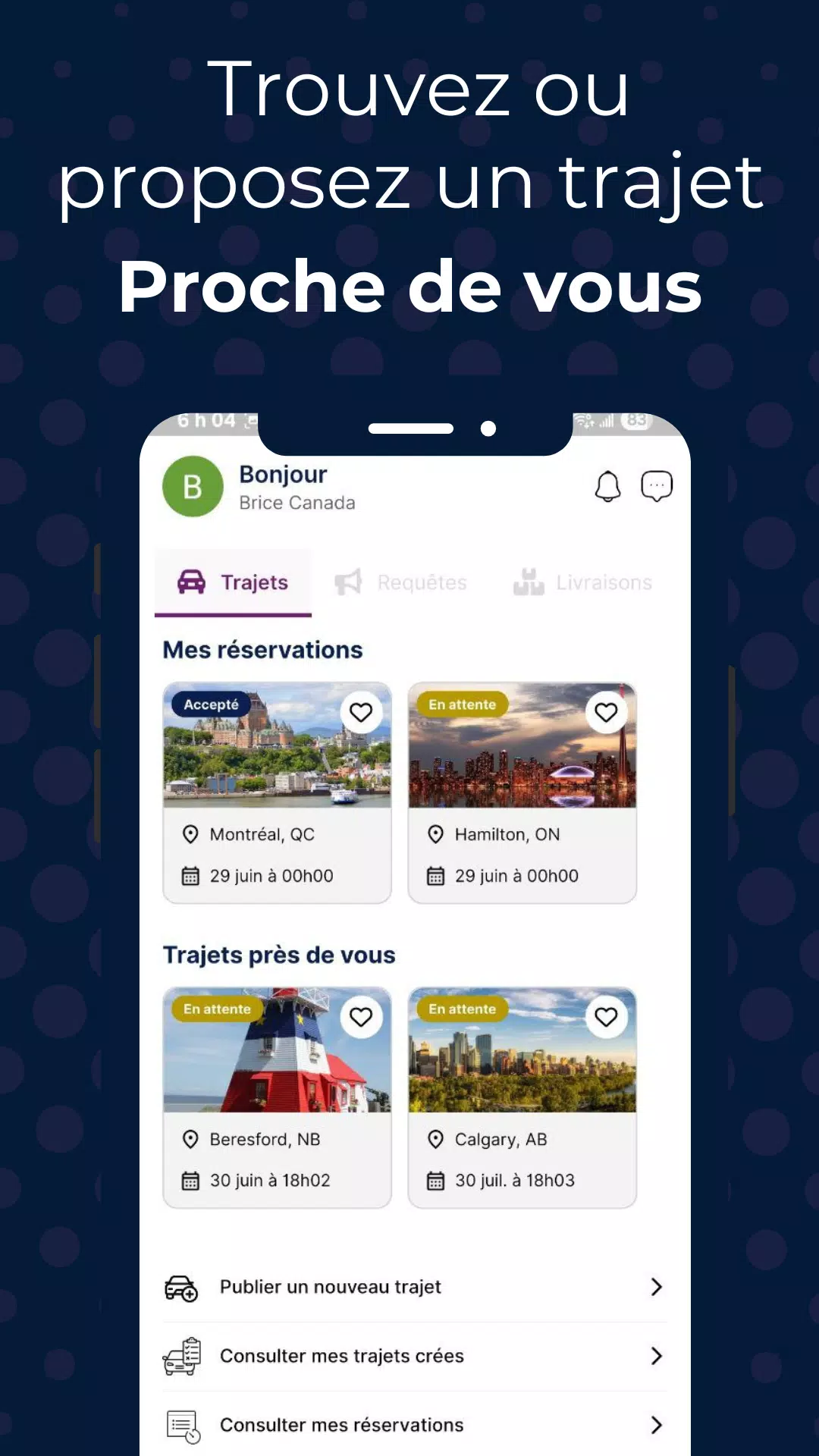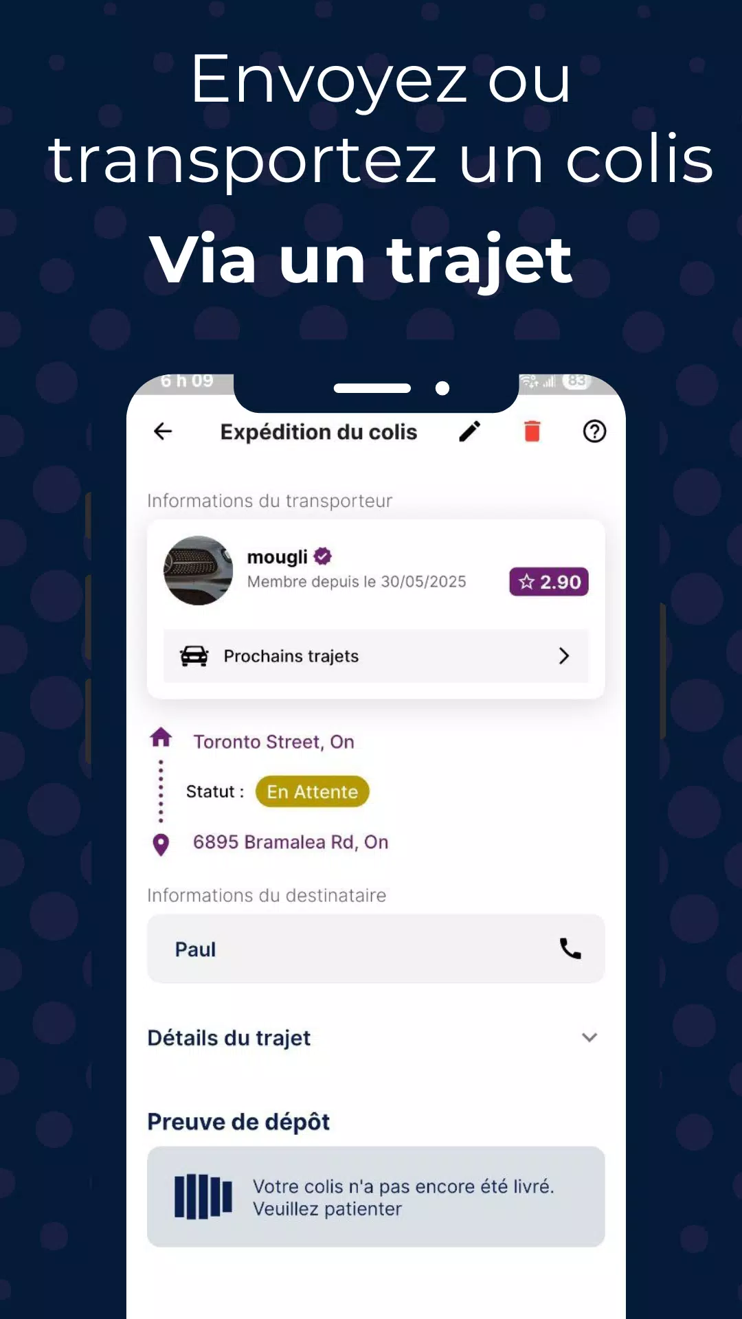 Driv Covoiturage is the ultimate Canadian app for sharing rides and shipping packages. By connecting with a community of reliable drivers and passengers across the country, you can easily find or offer rides in your area, as well as send or transport packages on existing trips. With a focus on major cities, Driv offers a secure platform with identity verification, messaging between users, and a rating system for added trust. Whether you're in Montreal, Toronto, Ottawa, or anywhere else in Canada, Driv allows you to share rides, save money on shipping, support local services, and reduce your carbon footprint. Download Driv now and join the smart carpooling movement in Canada for people, packages, and the planet.
