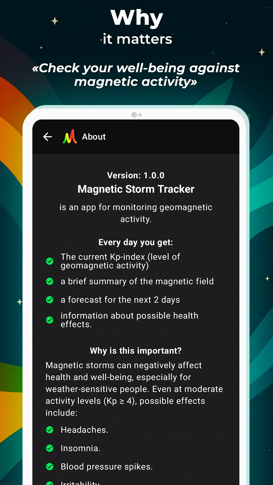 "Magnetic Storm Tracker" is a user-friendly app that provides essential information about magnetic storms, solar activity, and geomagnetic disturbances in a simple and accessible way. With features like forecasts, kp-index monitoring, and historical data, this app is perfect for anyone interested in tracking space weather and its impact on daily life. Stay informed and prepared with the "Magnetic Storm Tracker" app. Download it now for free and take control of your well-being amidst changing magnetic conditions.