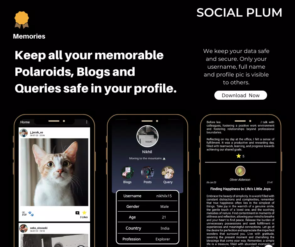 In conclusion, Social Plum: Share & Inspire is a visually stunning and versatile app that combines the charm of Polaroid pictures, the creativity of blogging, the vibrancy of a community, and the engagement of thought-provoking questionnaires. Whether you're an avid storyteller, a memory enthusiast, or someone who appreciates the beauty of life's fleeting moments, Social Plum is the perfect platform to capture, share, and connect through your unique experiences. Download Social Plum today and embark on a journey of creativity, inspiration, and lasting connections.