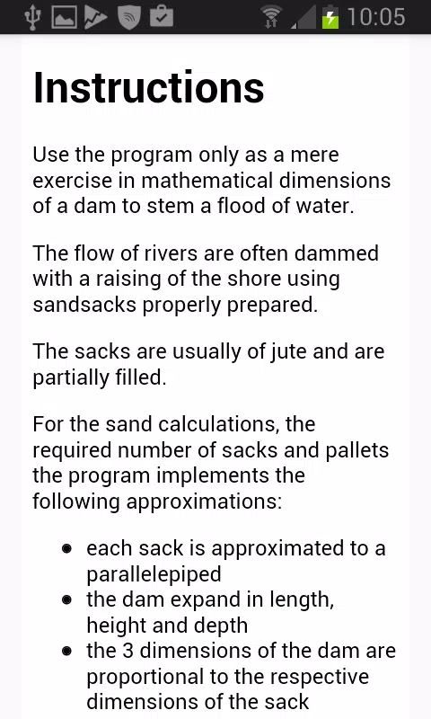 - Ease of Use: The app provides clear and simple instructions on how to use it for calculating the dimensions of a dam using sandsacks.