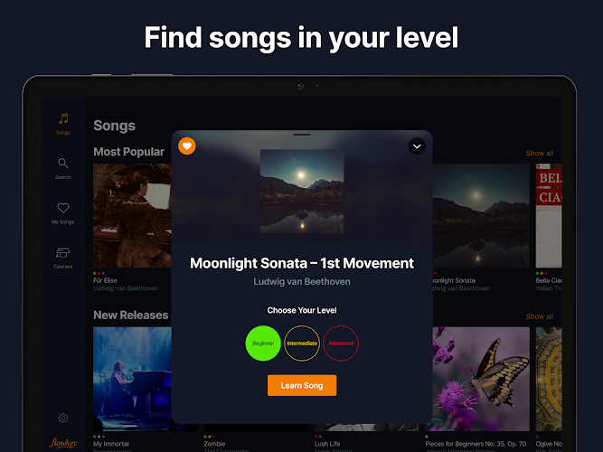 flowkey offers a rich selection of songs across all difficulty levels and genres, including Classical, Pop, Film & TV, Video Games, and more. You can easily choose your favorite pieces to play and improve your piano skills.