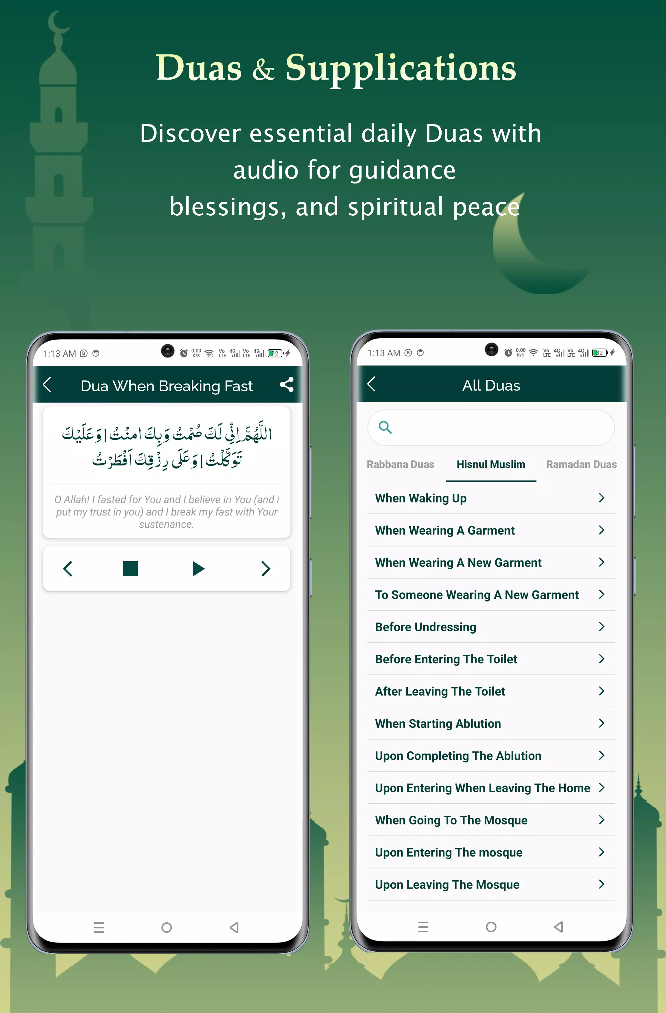 ⭐ Supplications - Duas with Audio Recitation: Explore daily Duas with audio recitation and translations, making it easy to incorporate these prayers into your daily routine and strengthen your connection with Allah.