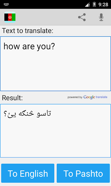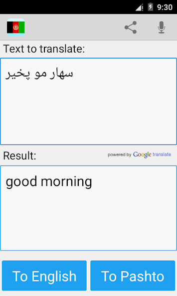 Introducing "Pashto English Translator," a handy application that bridges the language gap between English and Pashto! Perfect for students, travelers, and anyone looking to learn the language, this app offers quick and efficient translations in both directions. With features like voice input, speech output, and easy sharing options, it's a must-have tool for communication. Simply input your text, choose the desired language, and watch the translation appear in seconds. Whether you're studying Pashto or exploring new cultural experiences, "Pashto English Translator" is your go-to companion for seamless language conversion on the go!