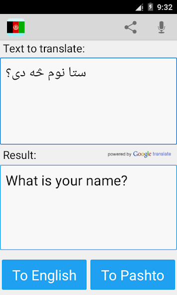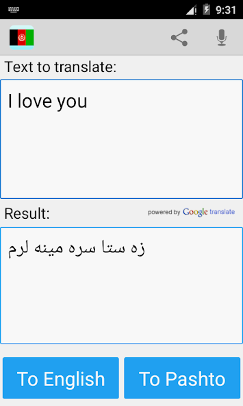 The Pashto English Translator app is a versatile tool that offers quick and convenient translations between English and Pashto. With features like voice input, speech output, and easy sharing options, this app is ideal for students, tourists, and anyone looking to learn the Pashto language. Download the Pashto app now to experience seamless translation capabilities at your fingertips!