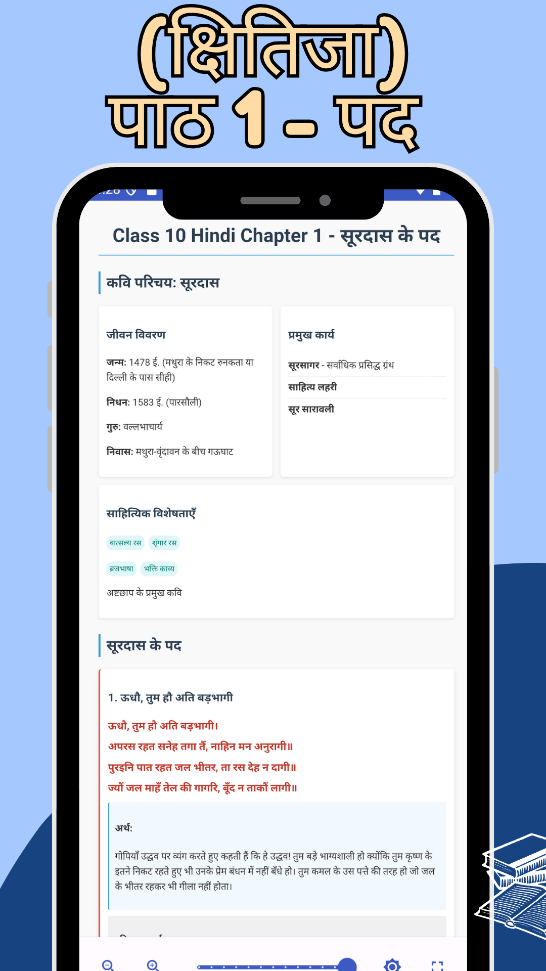 Ace your Class 10 Hindi exams effortlessly with the all-in-one Class 10 Hindi Solutions NCERT app! Tailored for CBSE students, this comprehensive tool covers entire NCERT Class 10 Hindi syllabus, including summaries, grammar, and multiple-choice questions from all four official textbooks. Whether you're preparing for last-minute reviews, school exams, or seeking homework assistance, this app is your go-to guide. With easy-to-understand explanations, concise chapter summaries, and offline access, this app ensures a stress-free learning experience. Enhance your comprehension and excel in your exams with Class 10 Hindi Solutions NCERT app - your ultimate study companion!