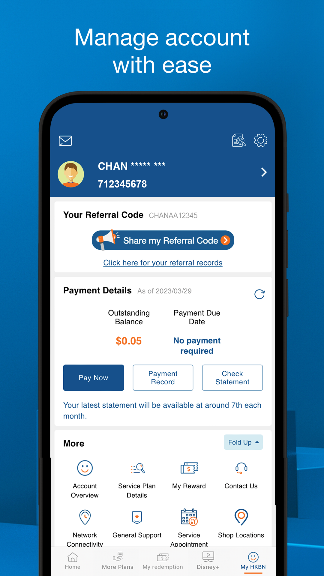 - Users can easily view and manage their HKBN account details, such as existing plans, outstanding balances, and monthly statements.