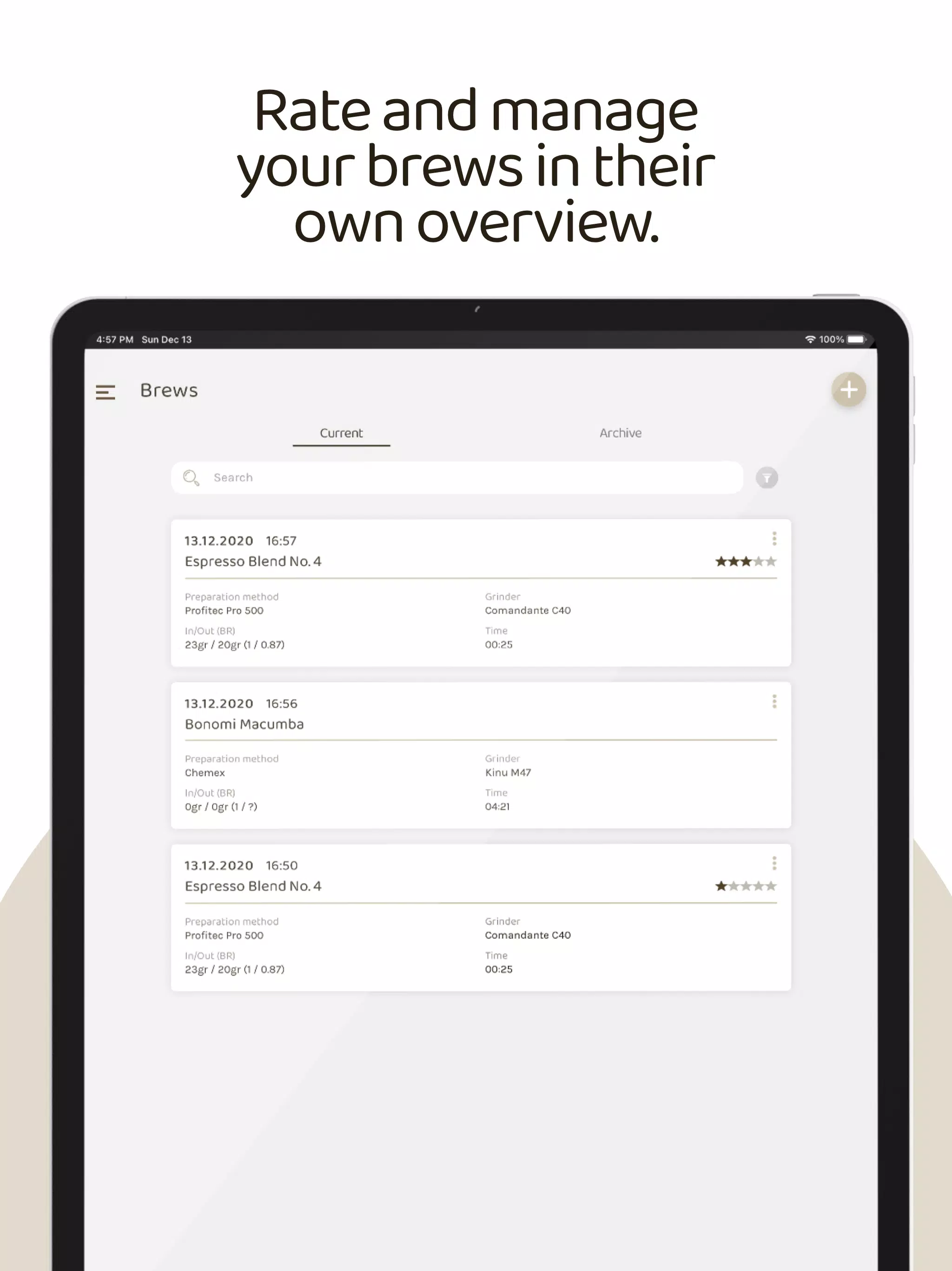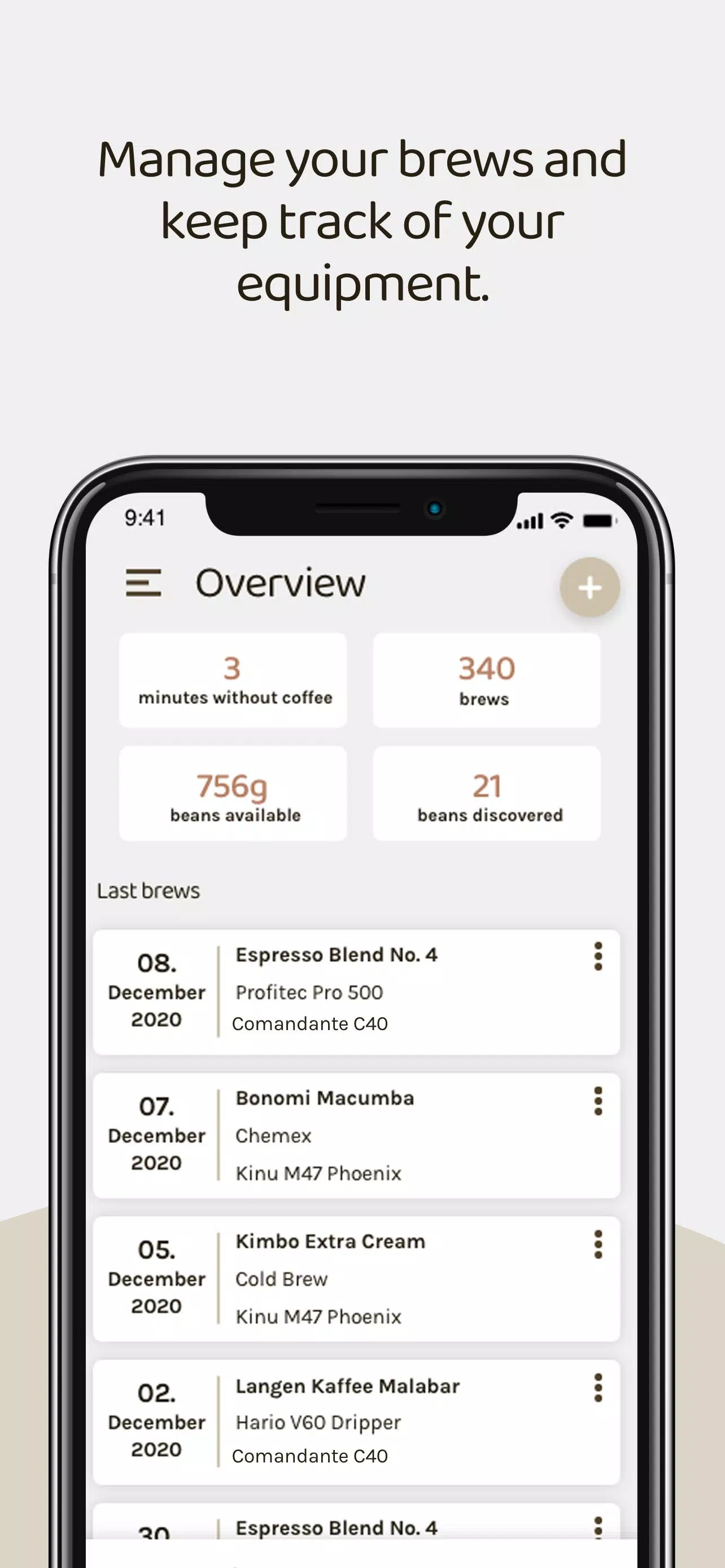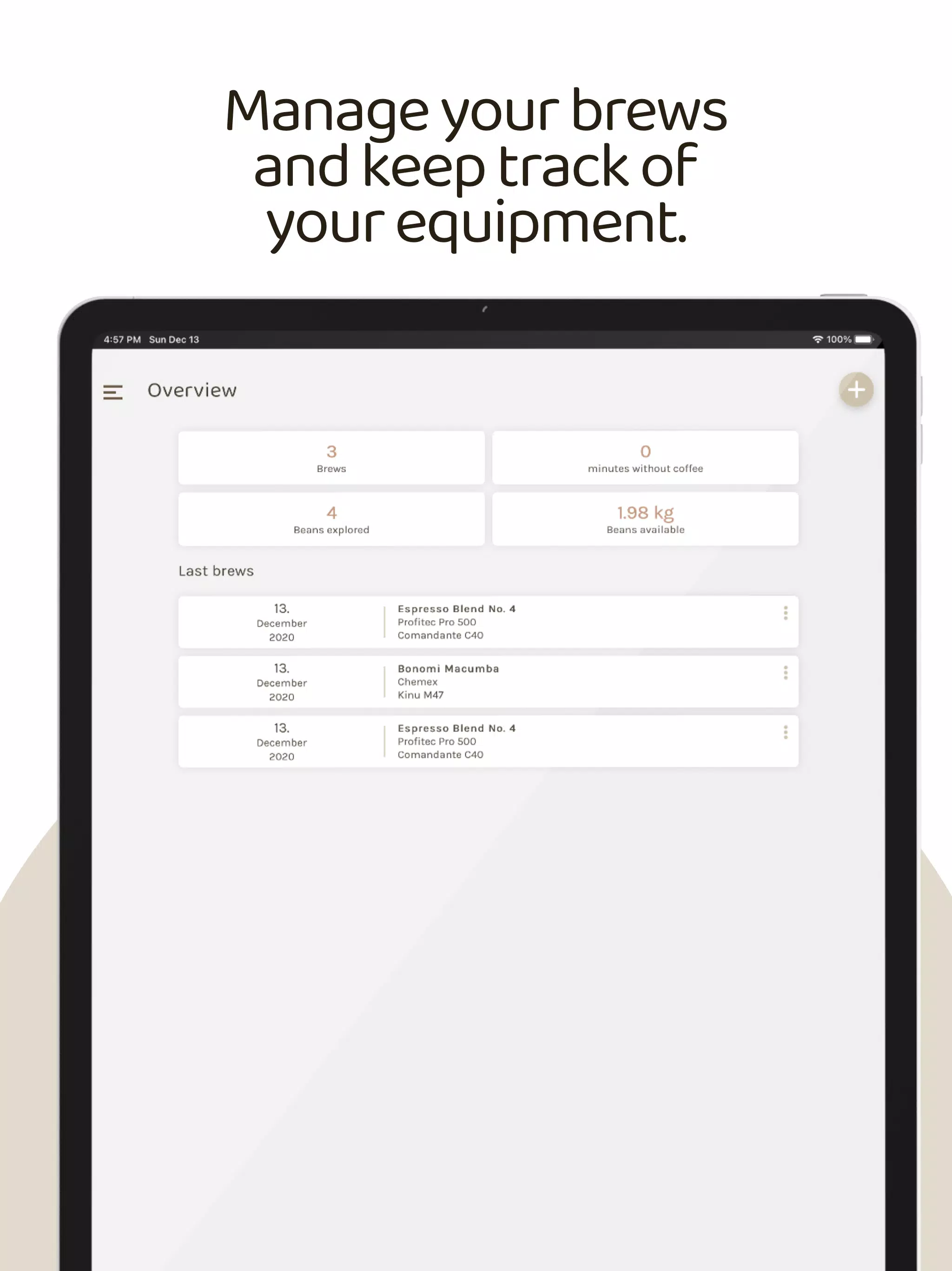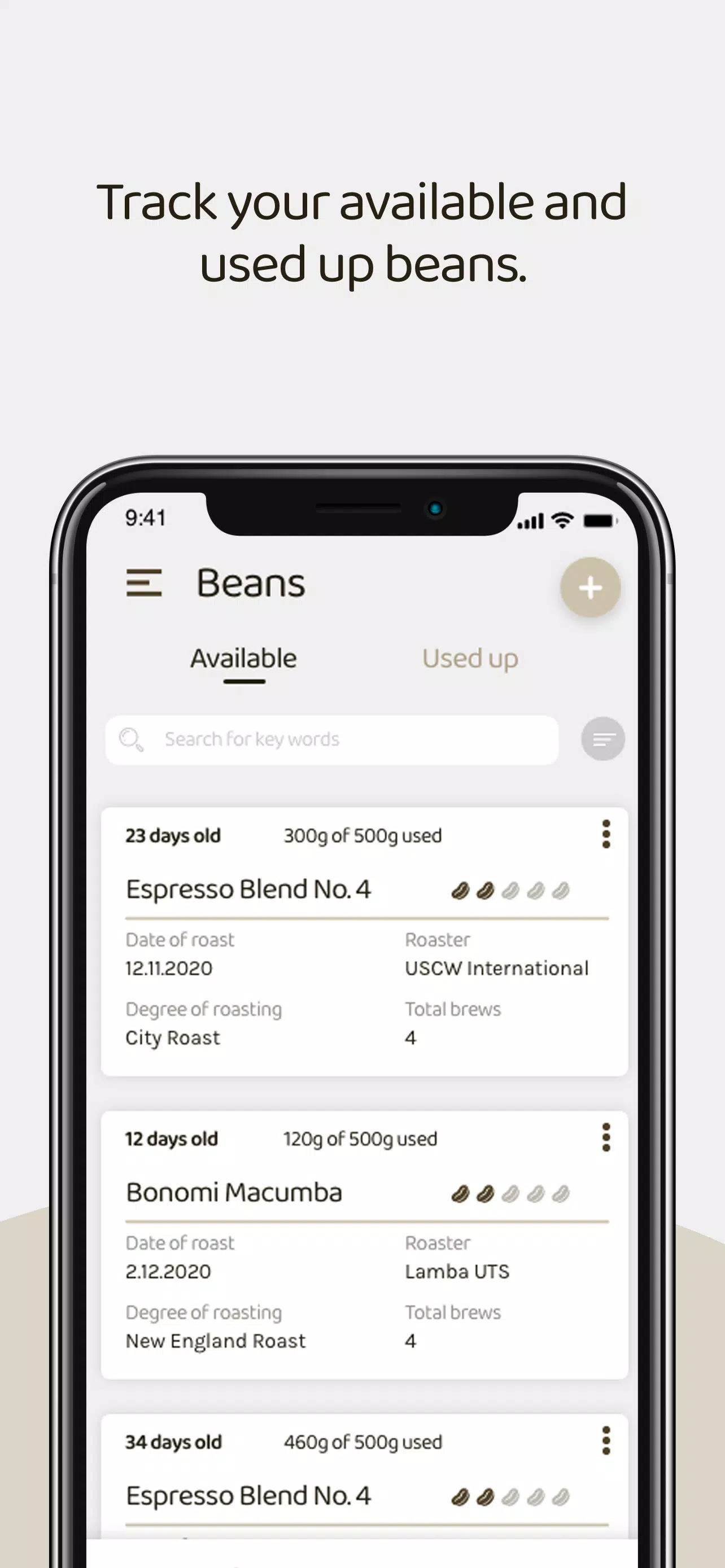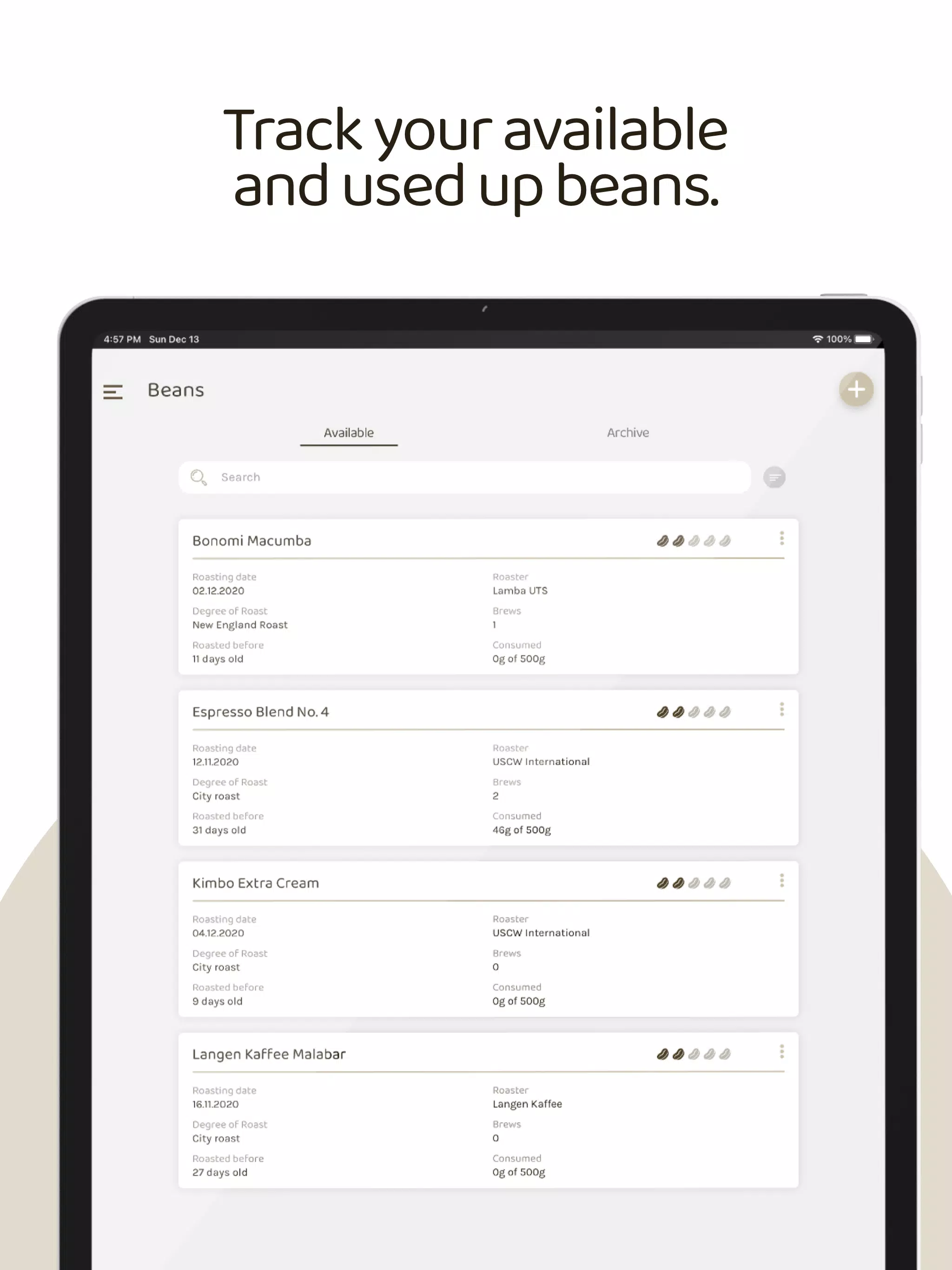 Bean Tracking: Easily keep track of all your beans by scanning or importing detailed information. Beanconqueror will also monitor your bean inventory so you never run out unexpectedly.