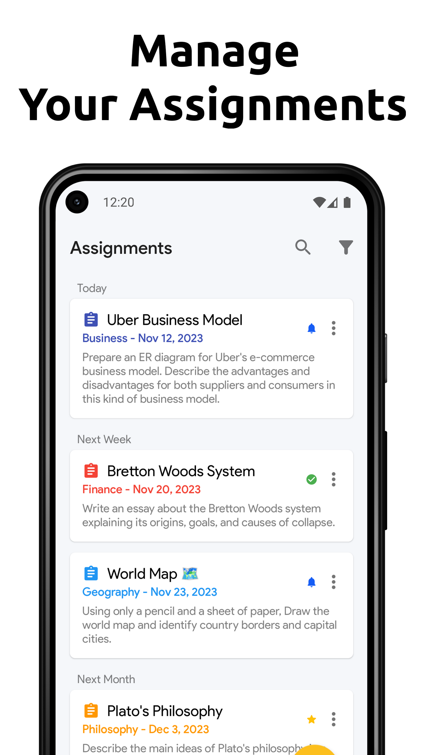 This app is designed to help you track your assignments effortlessly. You can categorize them by date, course, or priority, and mark them as completed or pending to stay on top of your workload.