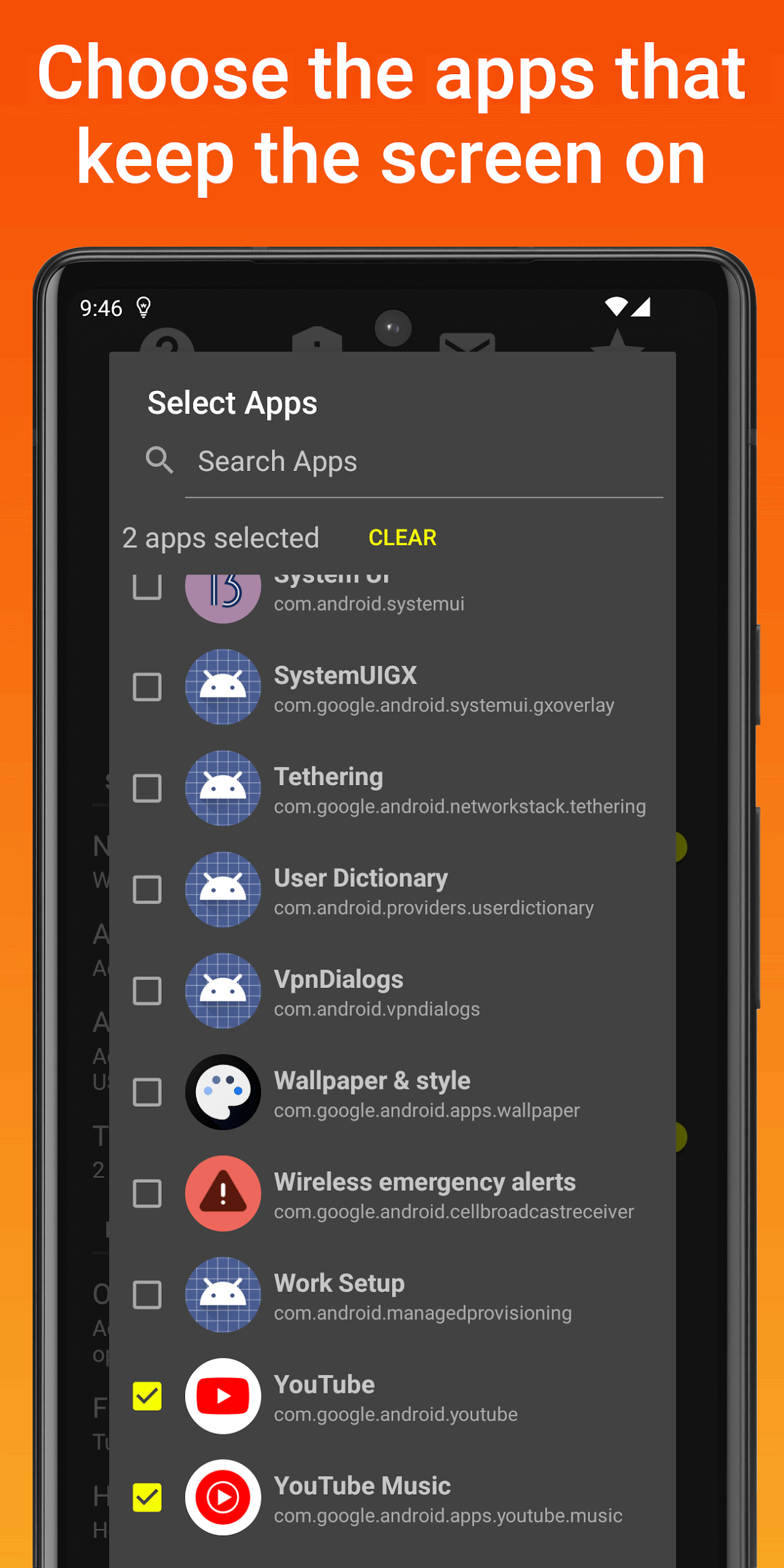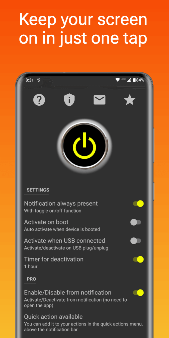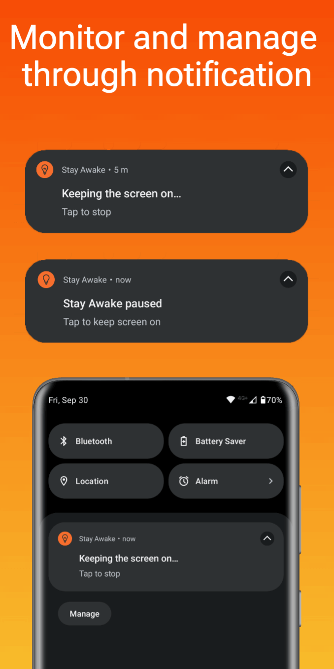 Customizable Settings: Select specific applications to keep the screen awake and change settings quickly from the notification without opening the app.