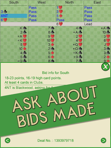 - Comprehensive Bid Analyser: The app includes a comprehensive Bridge bid analyser that supports various conventions such as 5 card majors, strong 2 clubs, weak 1NT, Jacoby Transfers, weak-2bids, and 2NT 11-12 points.