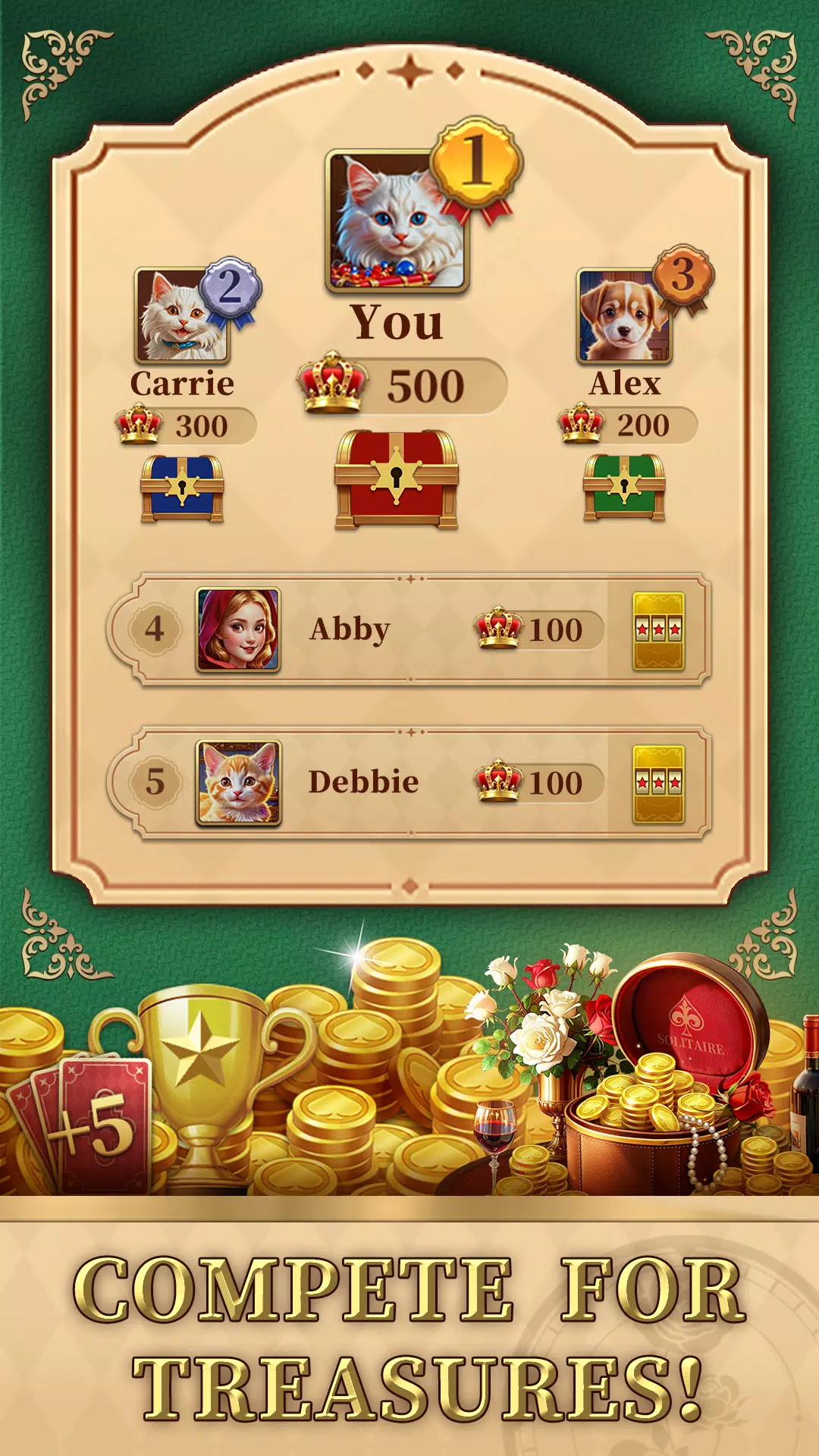 Discover the opulent world of Solitaire Royalty: Card Games, where regal elegance meets classic solitaire fun! Immerse yourself in a majestic palace of cards as you embark on a captivating journey through challenging levels. Show off your strategic skills by stacking cards with precision and creating magnificent sequences in this sophisticated board game experience. With stunning visual effects and royal aesthetics, every session will be truly memorable. Earn exclusive rewards and golden treasures by participating in daily challenges and special events. Whether you're a seasoned player or new to solitaire, this refined version of card games will keep you entertained for hours. Download now and experience the royal twist on classic solitaire!