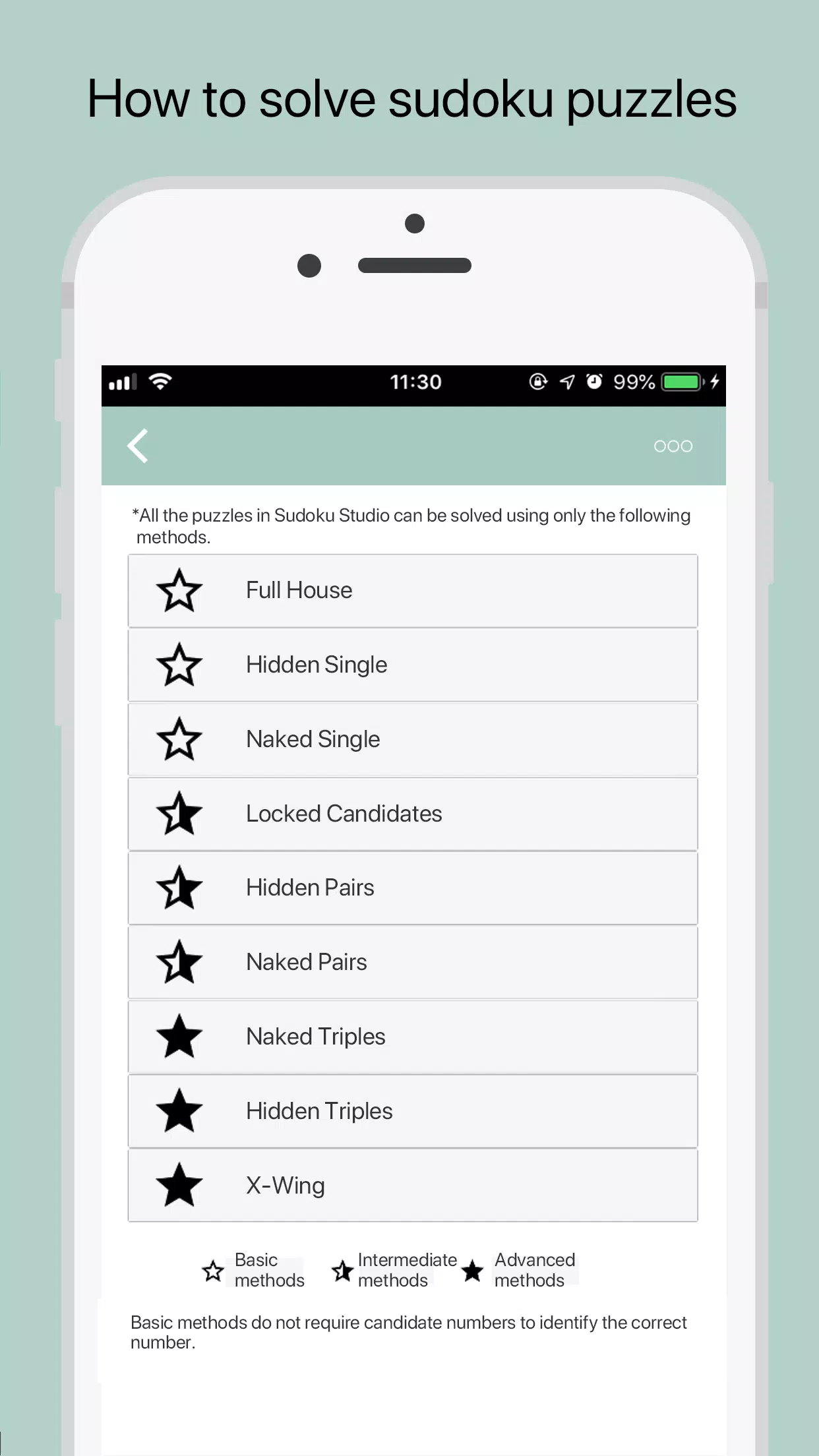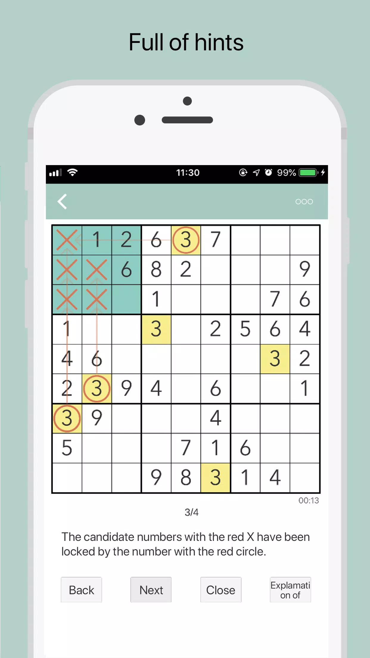 * Detailed Explanations: Learn different solving methods with detailed explanations and illustrations, from Hidden Single to X-Wing.
