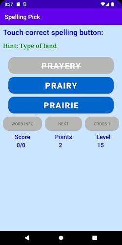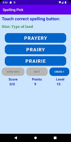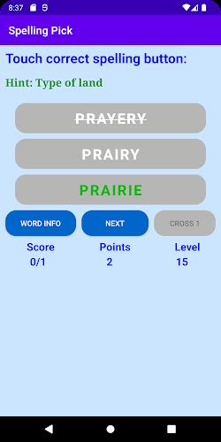 Enhance your language skills and boost your spelling ability with this addictive and user-friendly app. With quick loading times and easy-to-understand gameplay, you can test your knowledge and expand your vocabulary in an engaging way. Simply read the hint provided, choose the correct spelling from the options given, and earn points for each right answer. Need some help? Use the "WORD INFO" feature to learn more about the word after guessing its spelling. Want to earn more points? Hit the "ADD POINTS" button or continue picking the right spellings. Click "NEXT" to move on to the next challenge and keep the fun going!