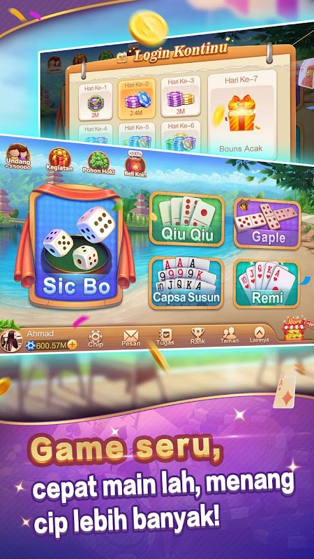 Answer: The app offers SicBo, Domino QiuQiu, Domino 99, Gaple, Remi, and Capsa Susun, all designed for an authentic local casino experience.