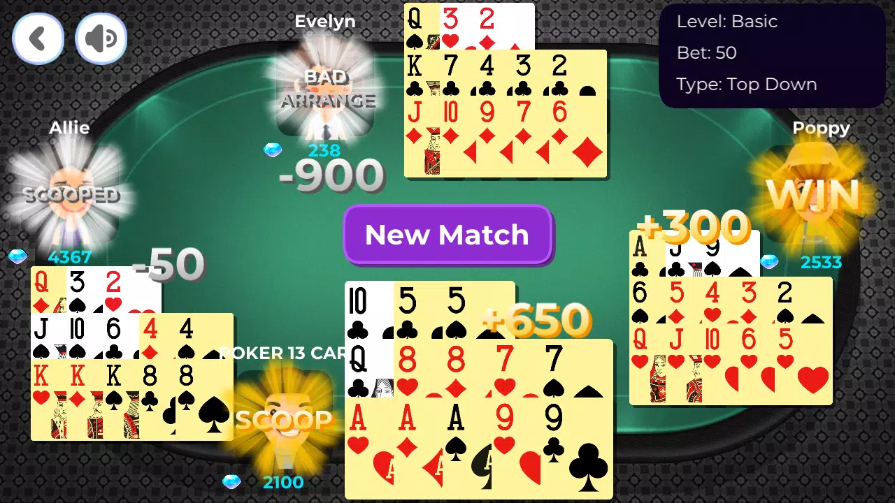 Chinese Poker Offline delivers a complete, engaging, and authentic poker experience with multiple game modes, intelligent AI opponents, and offline accessibility. Perfect for players of all levels, it provides a fun and challenging way to test your poker skills anytime. Dive in, sharpen your strategy, and enjoy the classic world of Chinese poker!